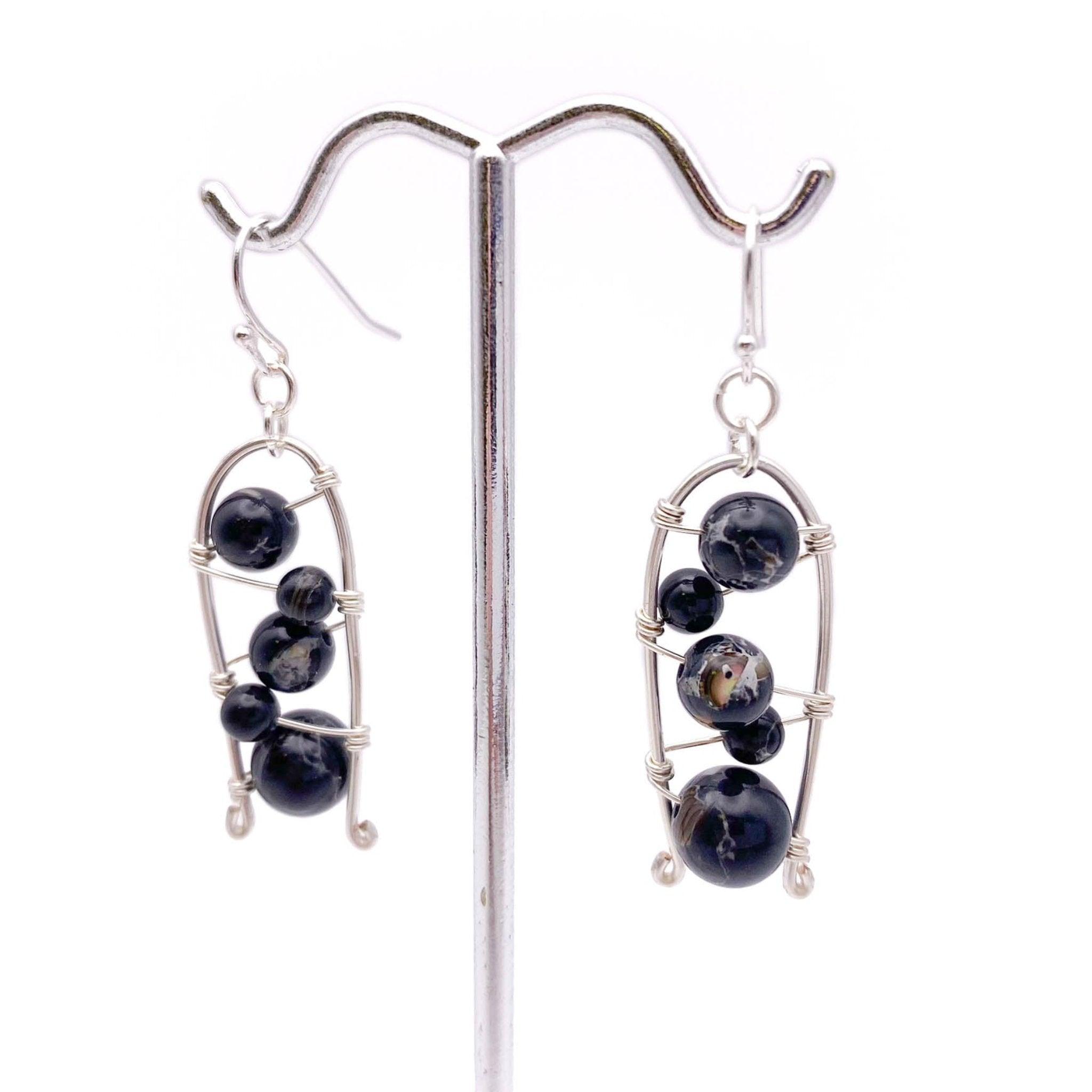 3 sizes of black mottled jasper beads slide freely on silver plated wire strung between a silver wire horseshoe shape. All suspended from a silver plated fishhook.