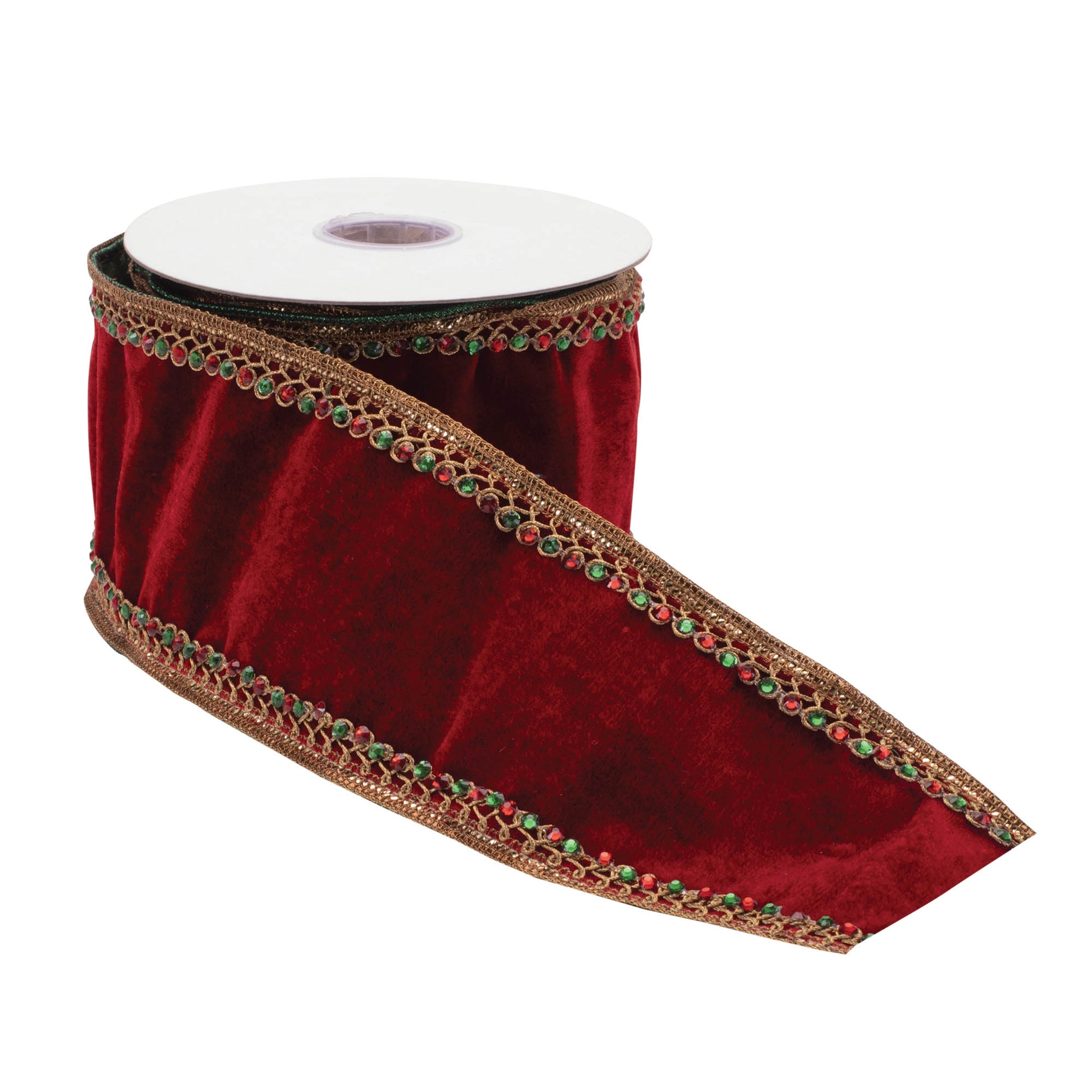 Add a luxurious touch to your holiday décor with this Jewel Trim Wired Ribbon. Featuring festive red and green tones, metallic gold trim, and shimmering jeweled accents, this ribbon is perfect for making your holiday arrangements, gift wrapping, and crafts stand out. The 4" wide, 5-yard length offers ample material for versatile displays, while the wired edges ensure easy handling and durable use. Make your seasonal projects sparkle with this elegant, eye-catching ribbon.