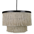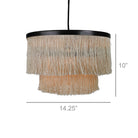A bronze frame drips with tiers of fringe in a warm blush hue giving your room a lively - yet tranquil - lighting feature. 5’ cloth-wrapped cord with canopy, plug in style is convertible to hard-wiring. Light bulb not included.