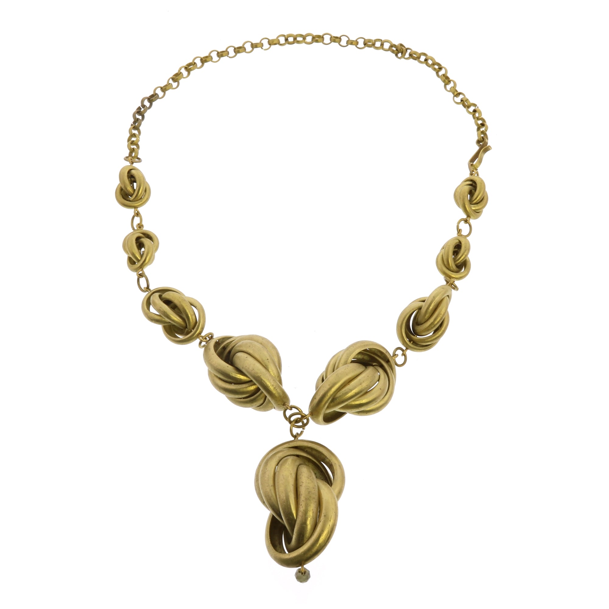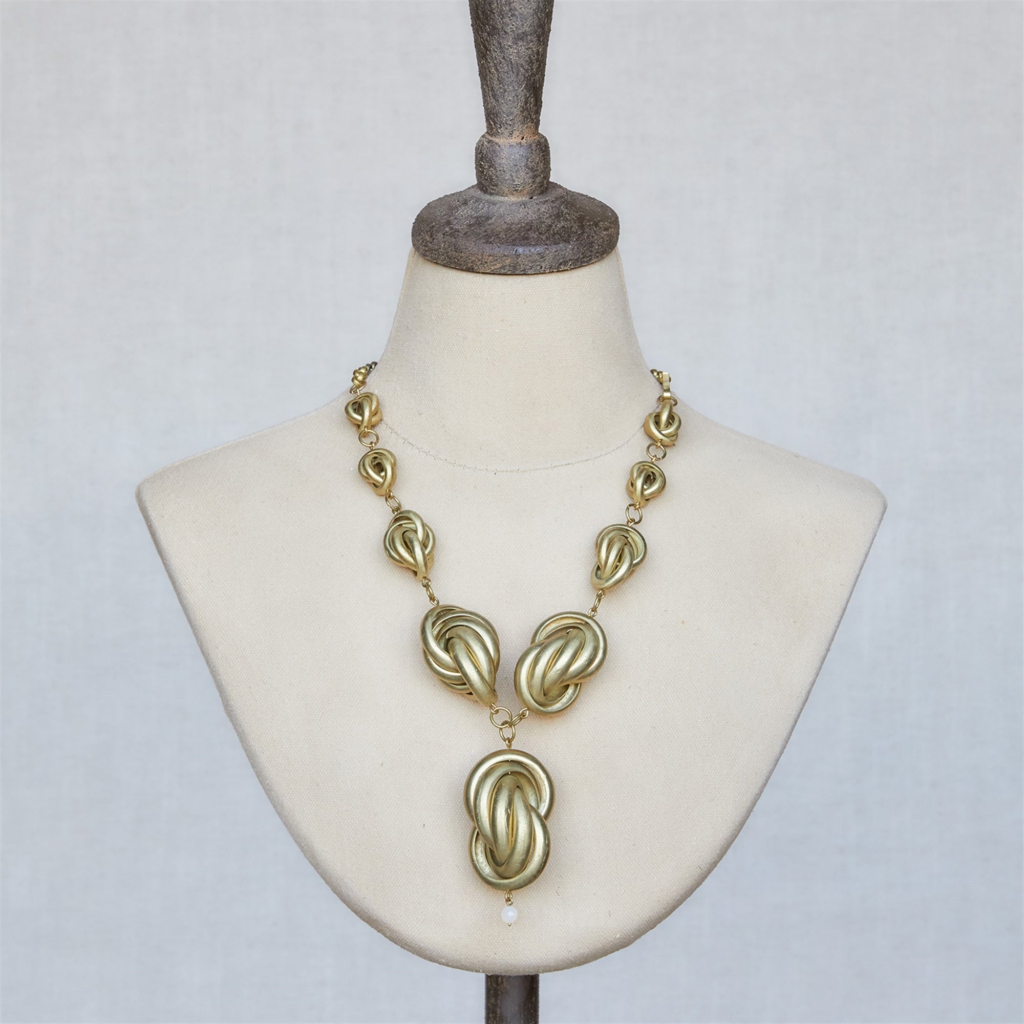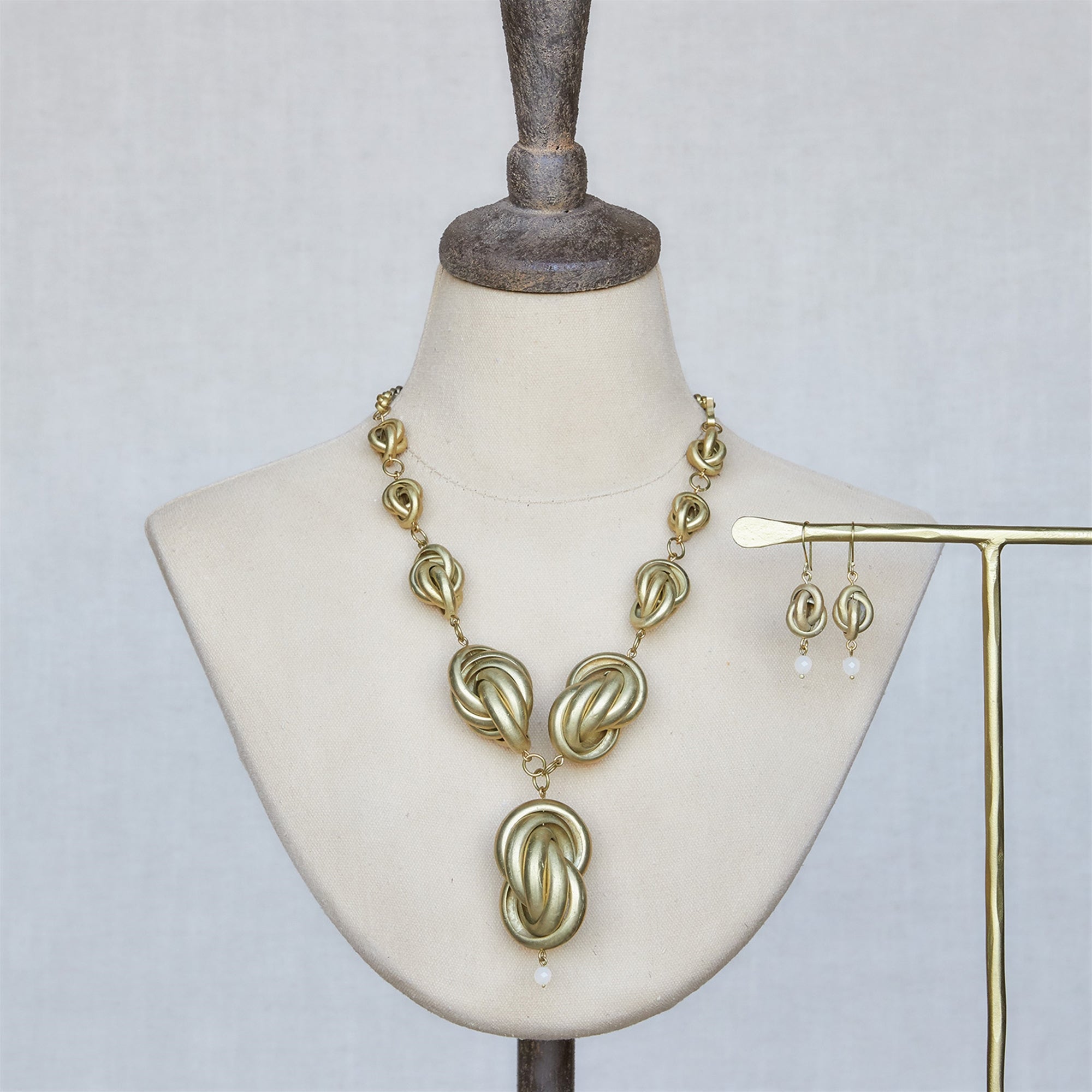 Concurrent circles of brass are linked together to form this fashionable jewelry collection. A faceted bead of white onyx finishes off the necklace. 24" length