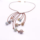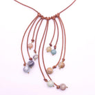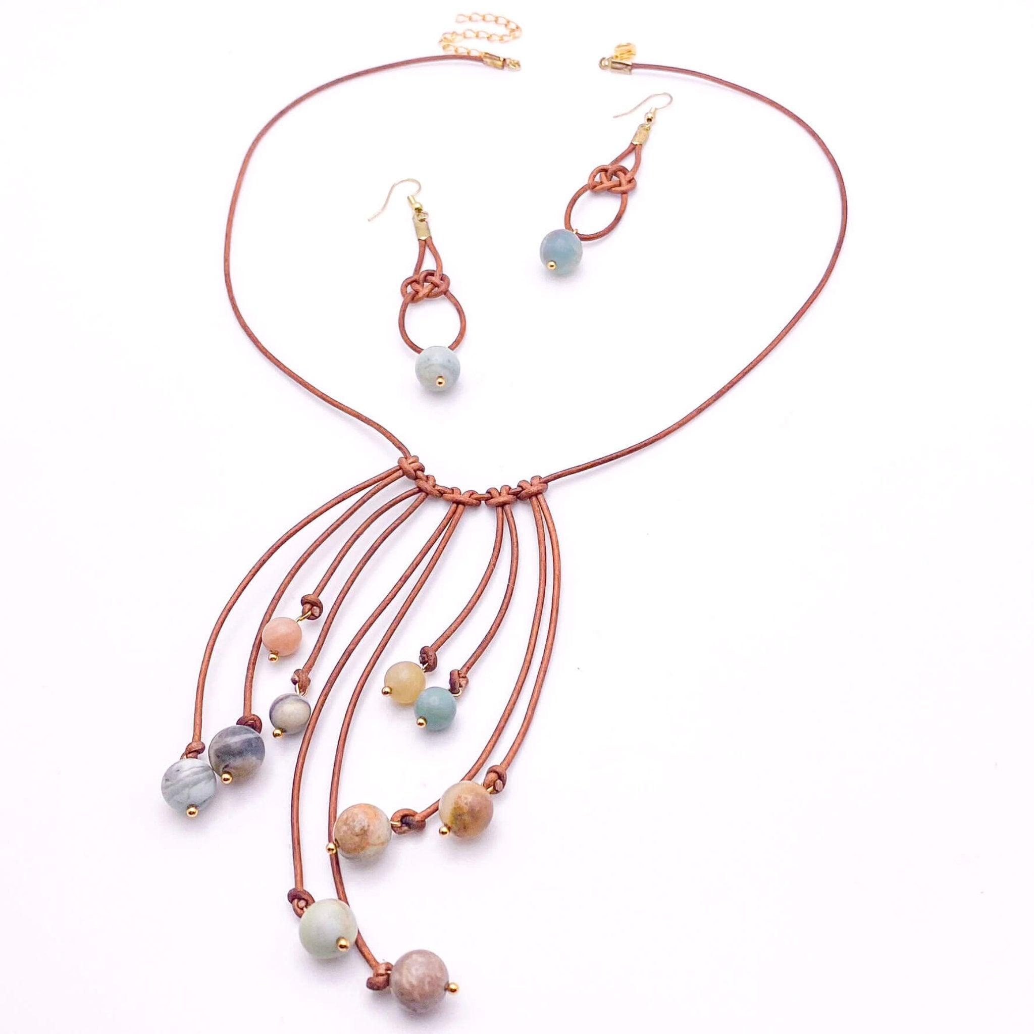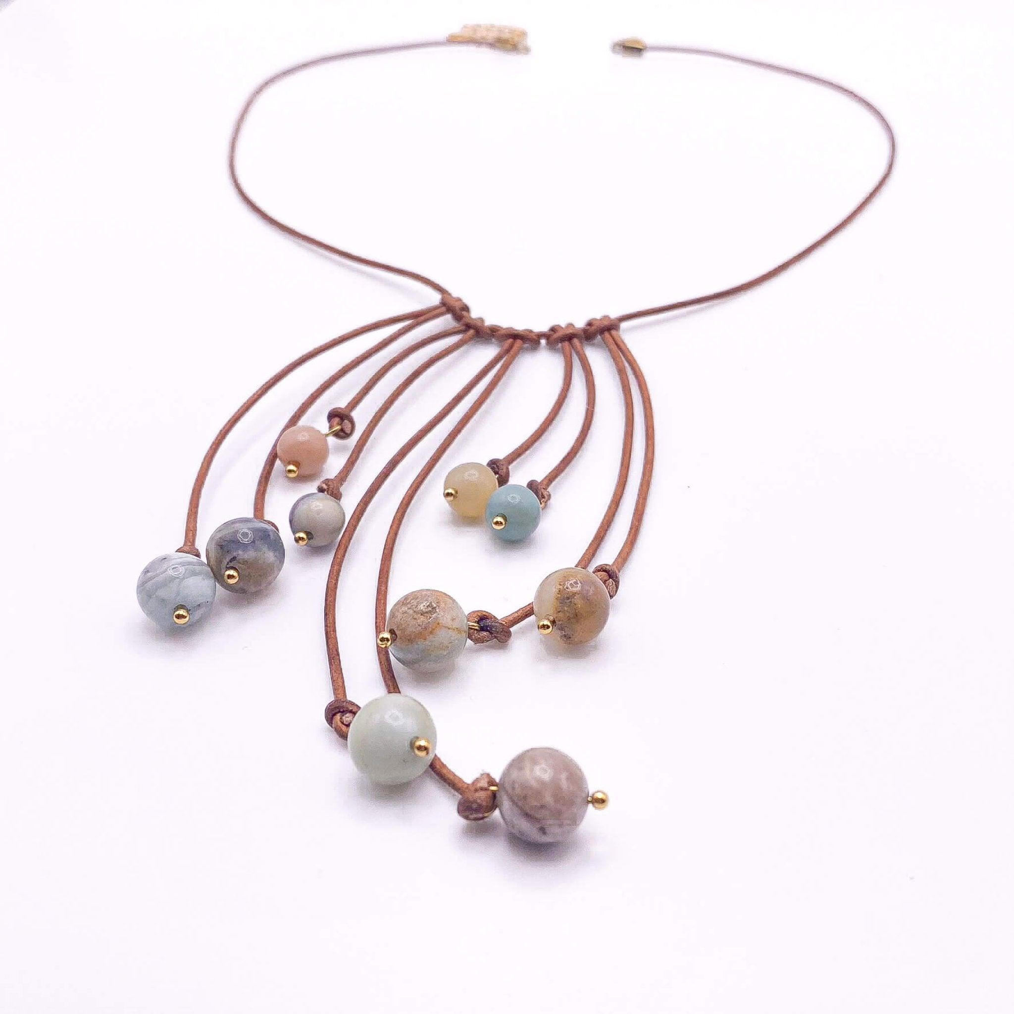 This statement bib necklace of chocolate hued genuine leather 18 inches long, with a 3 inch extender, has 5 various lengths of leather doubled and knotted over the necklace and genuine amazonite stones hanging from each end.