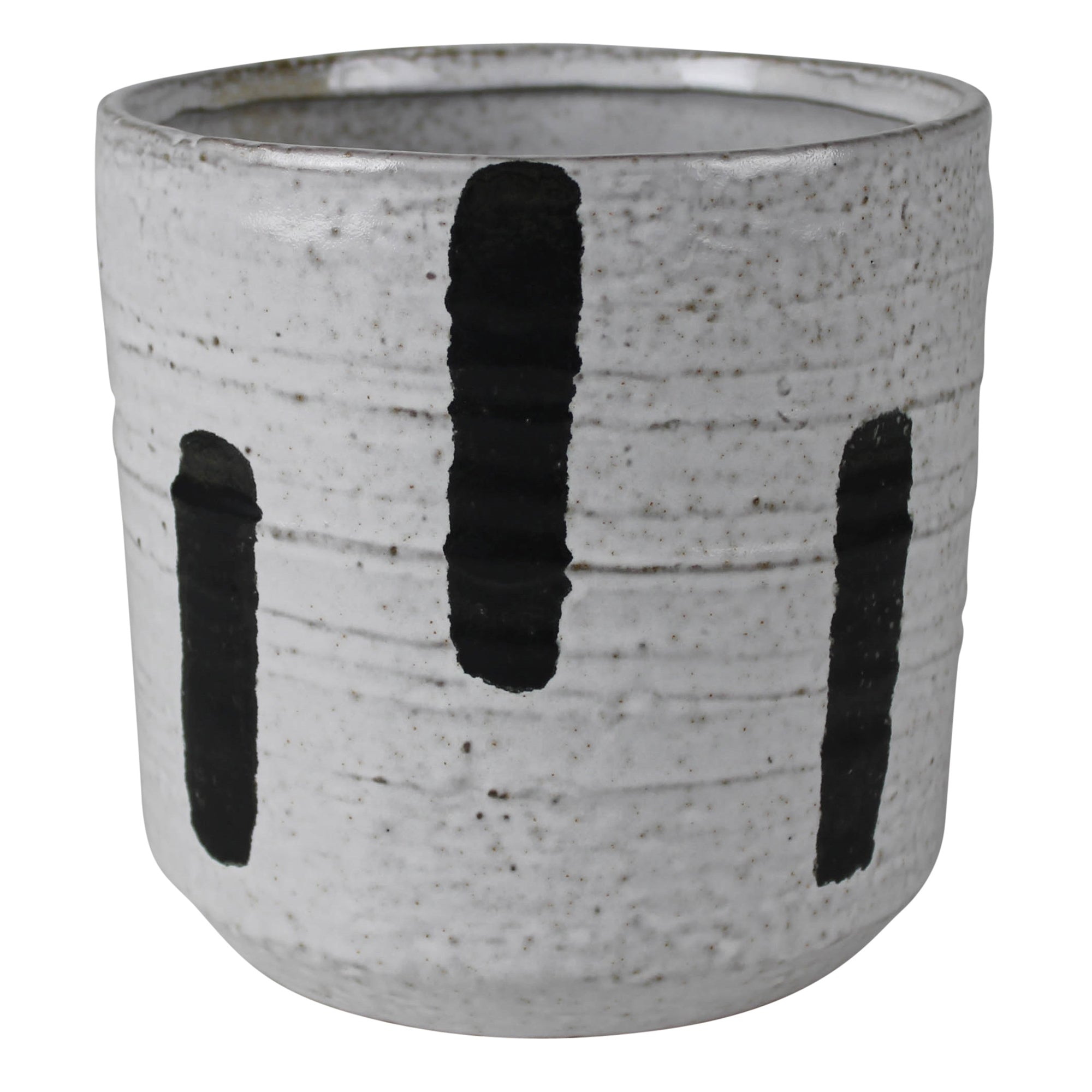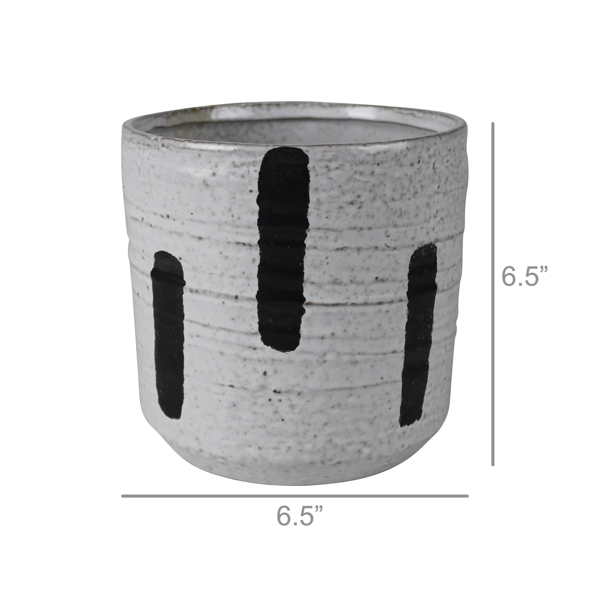The subtle horizontal texture on this ceramic cachepot is accentuated in gloss white glaze and counterbalanced with matte black vertical stripes.