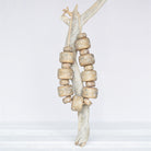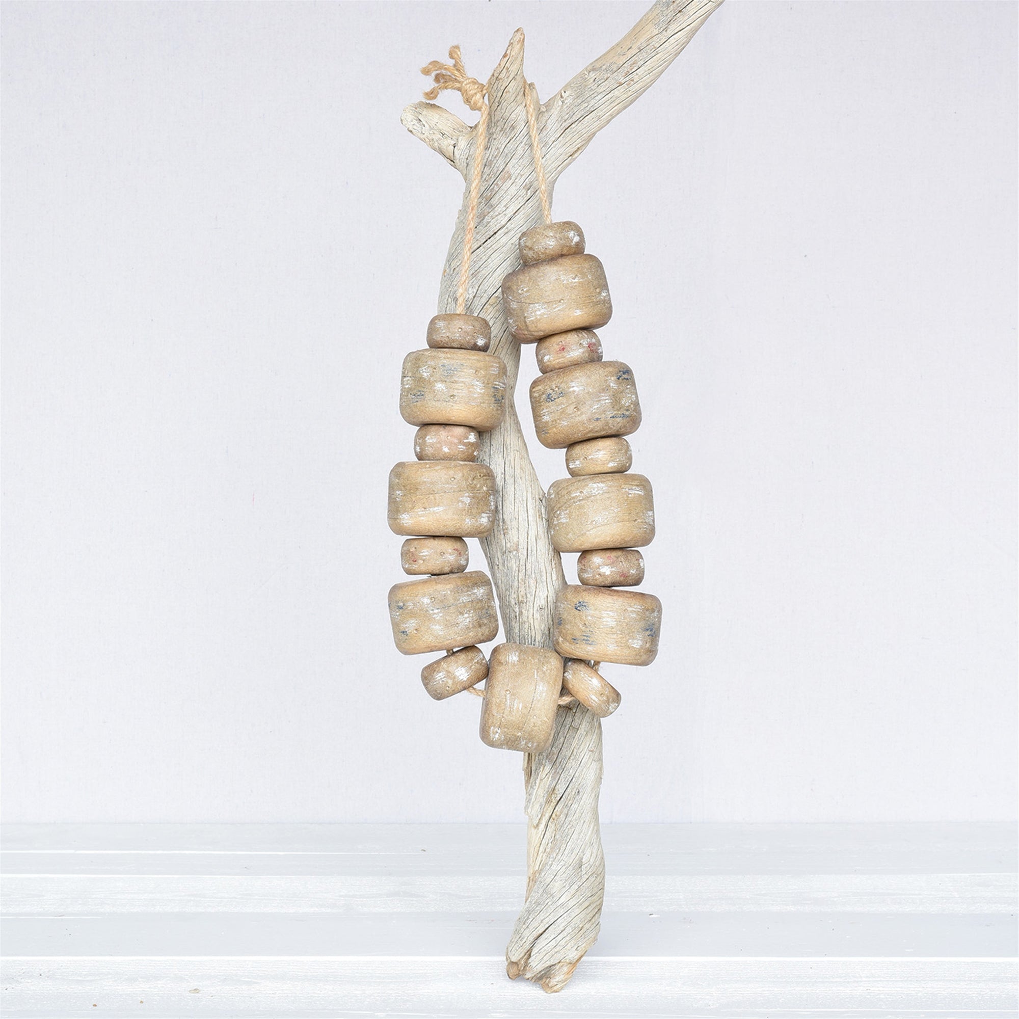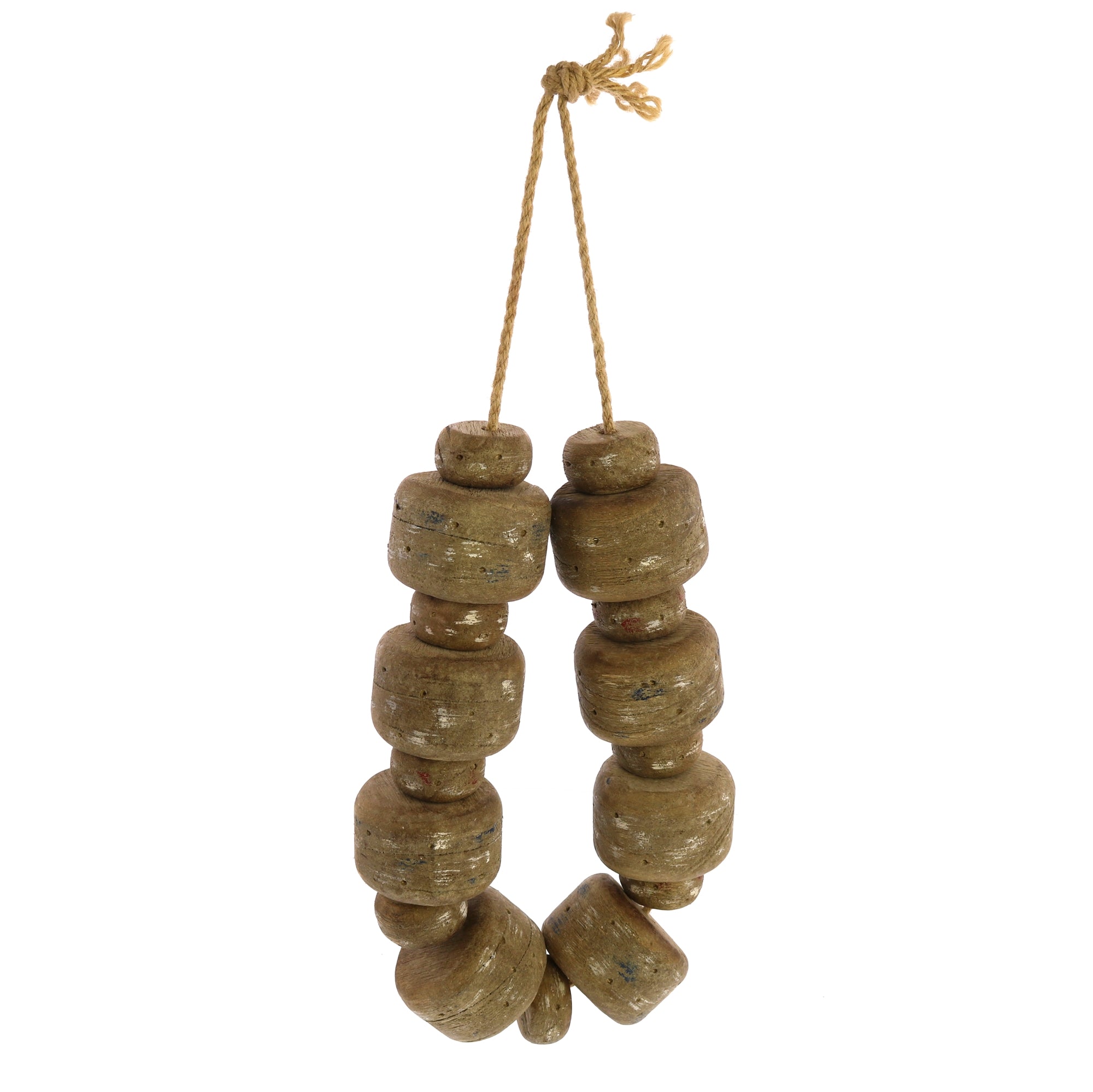 Varying sizes of Kiri Wood beads are strung together in this oversized decorative strand to add a fun pop of interest to a door knob, a chair rail or hung on the wall with a forged iron nail.