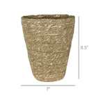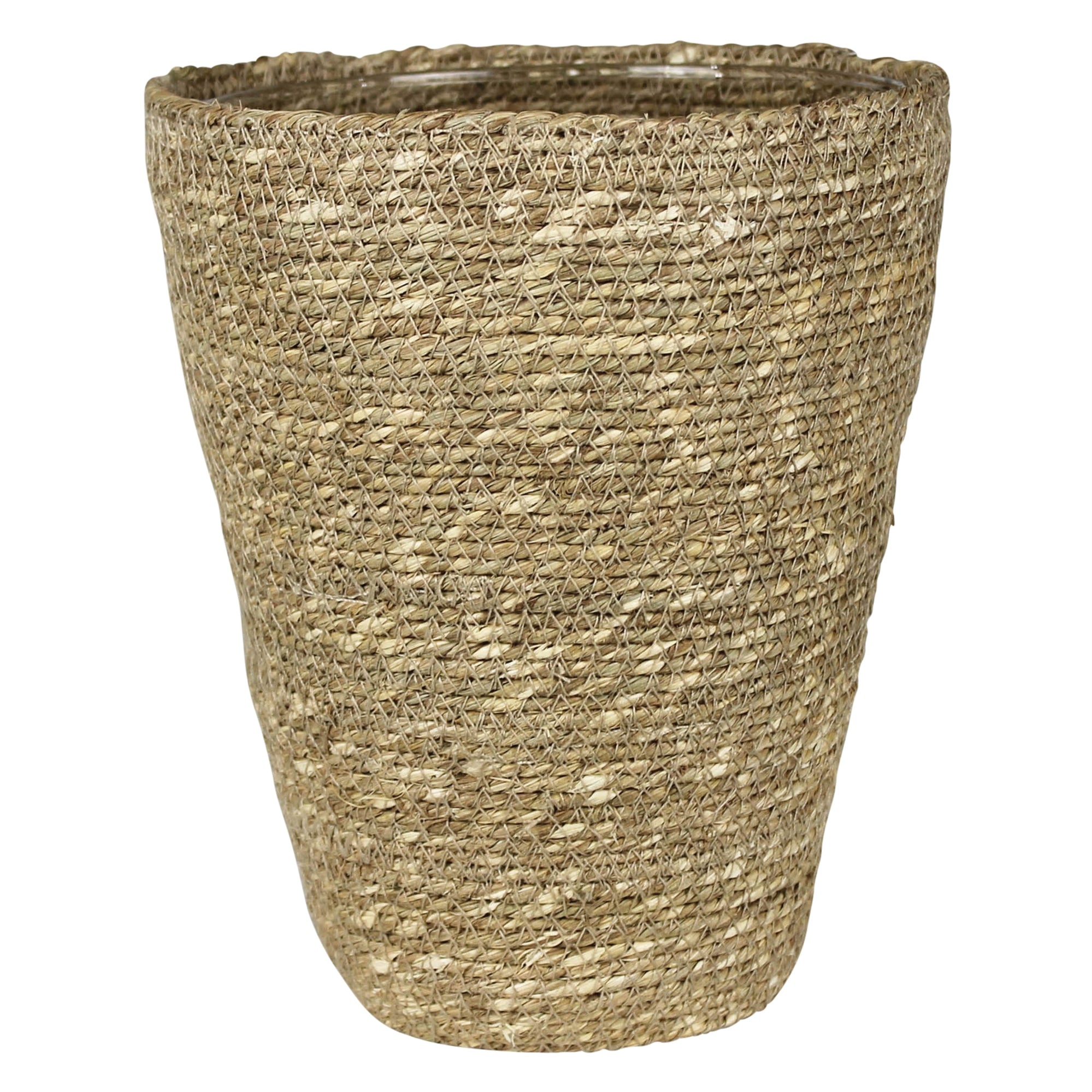 A glass hurricane sits inside a woven jute exterior producing a vessel that is ready to give candlelight a subtle glow or to be filled with a blousy floral arrangement.