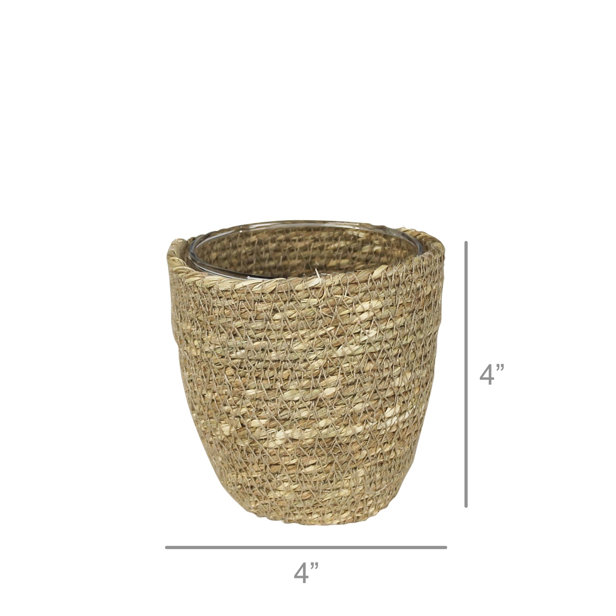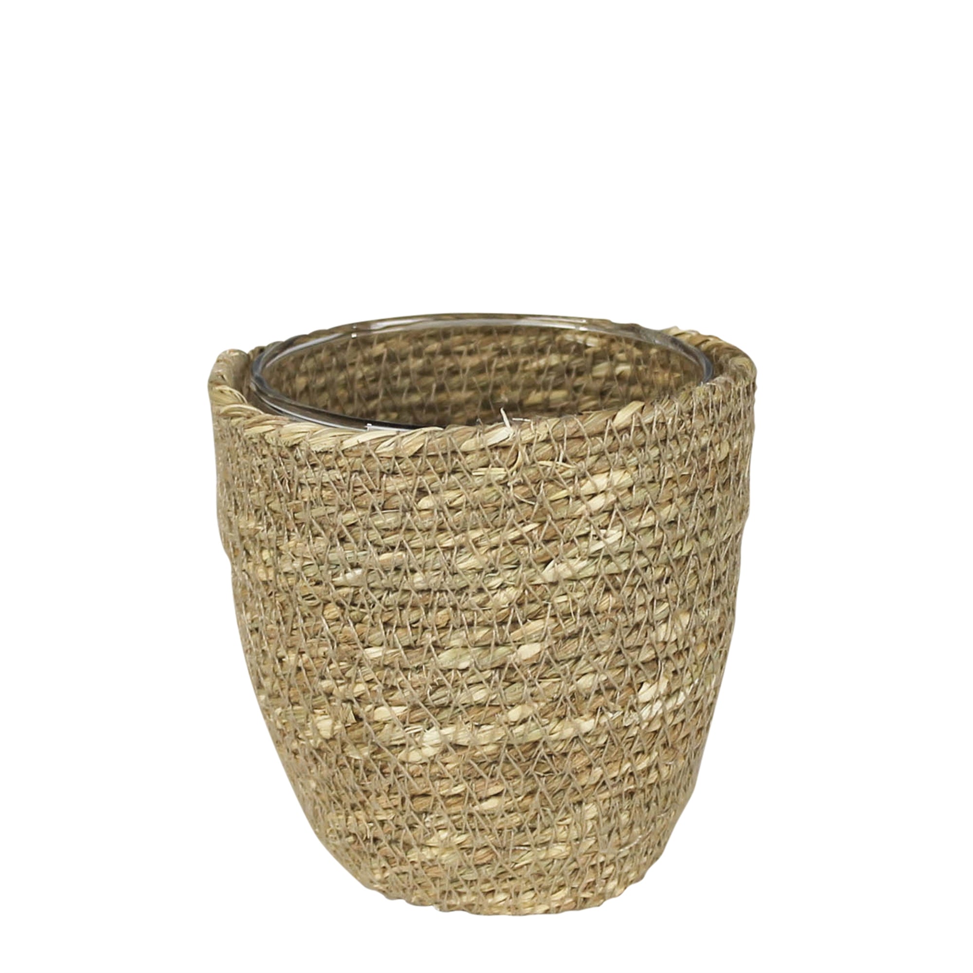 A glass hurricane sits inside a woven jute exterior producing a vessel that is ready to give candlelight a subtle glow or to be filled with a blousy floral arrangement.