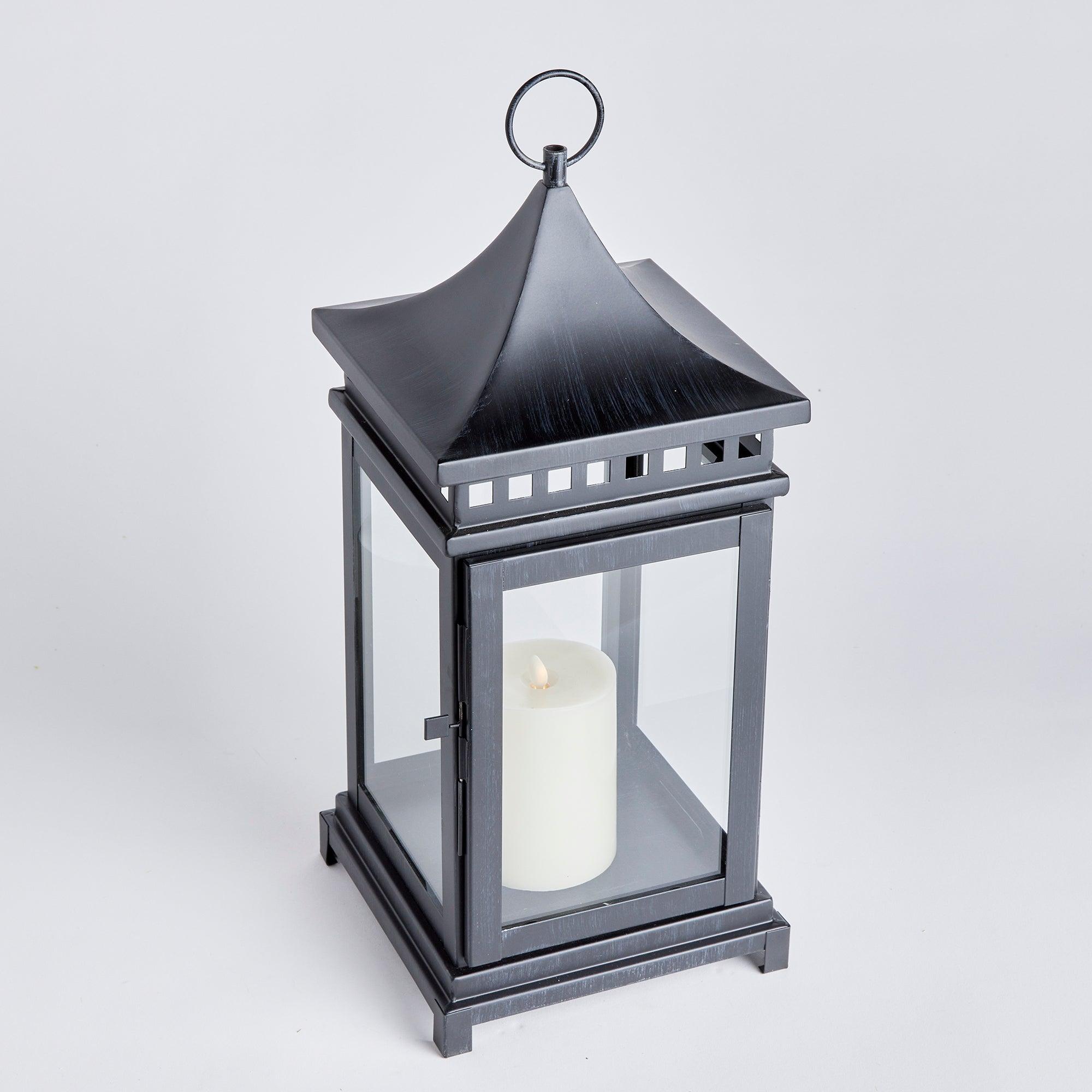 Simple in form and designed with a wide, sweeping top and a row of panes, this lantern is full of character. The powder-coated washed black finish gives it a sleek look that works well in any outdoor setting.