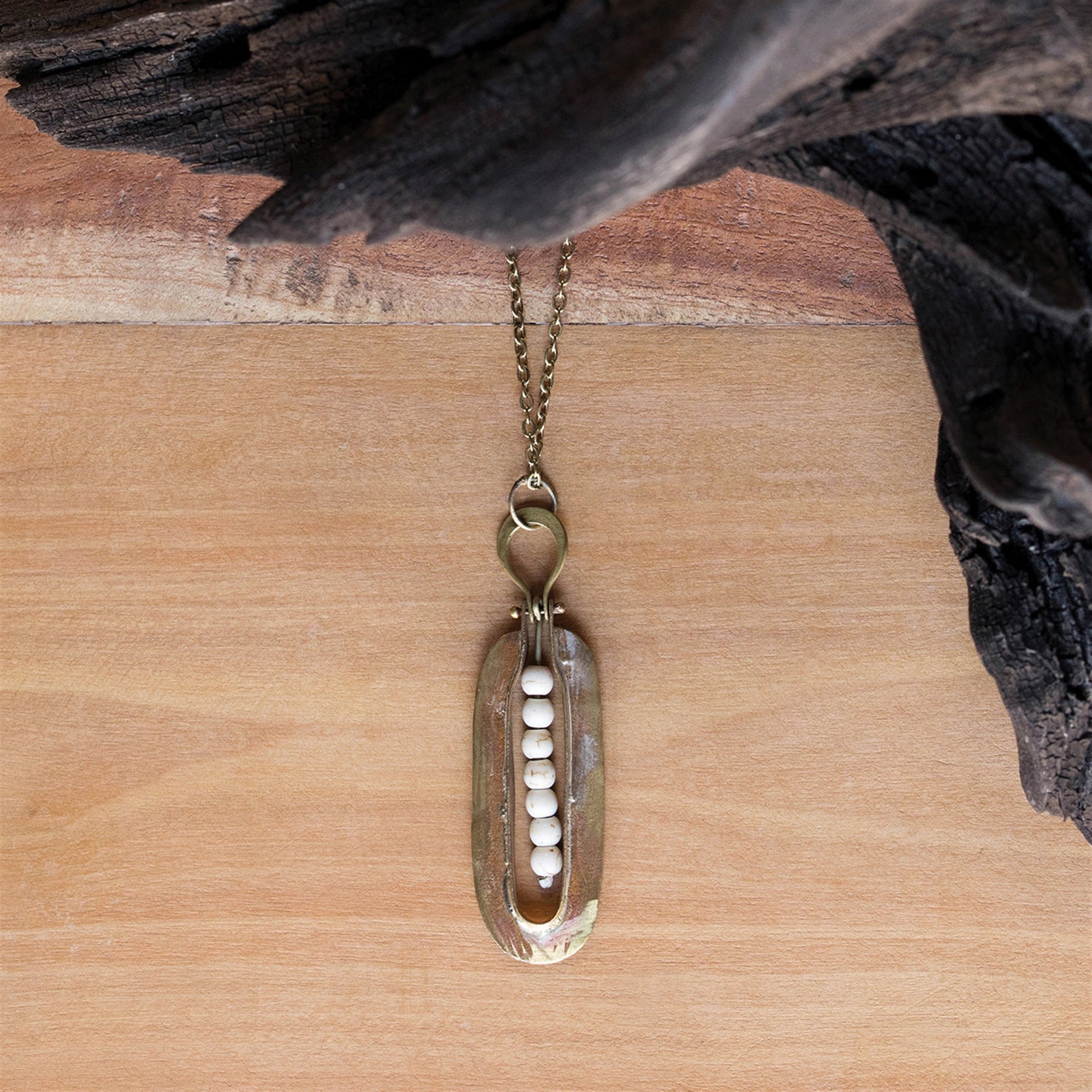 Stacks of black lava and white howlite beads are encased in brass forms in this beautifully detailed collection. 0.5" pendant, 18" chain