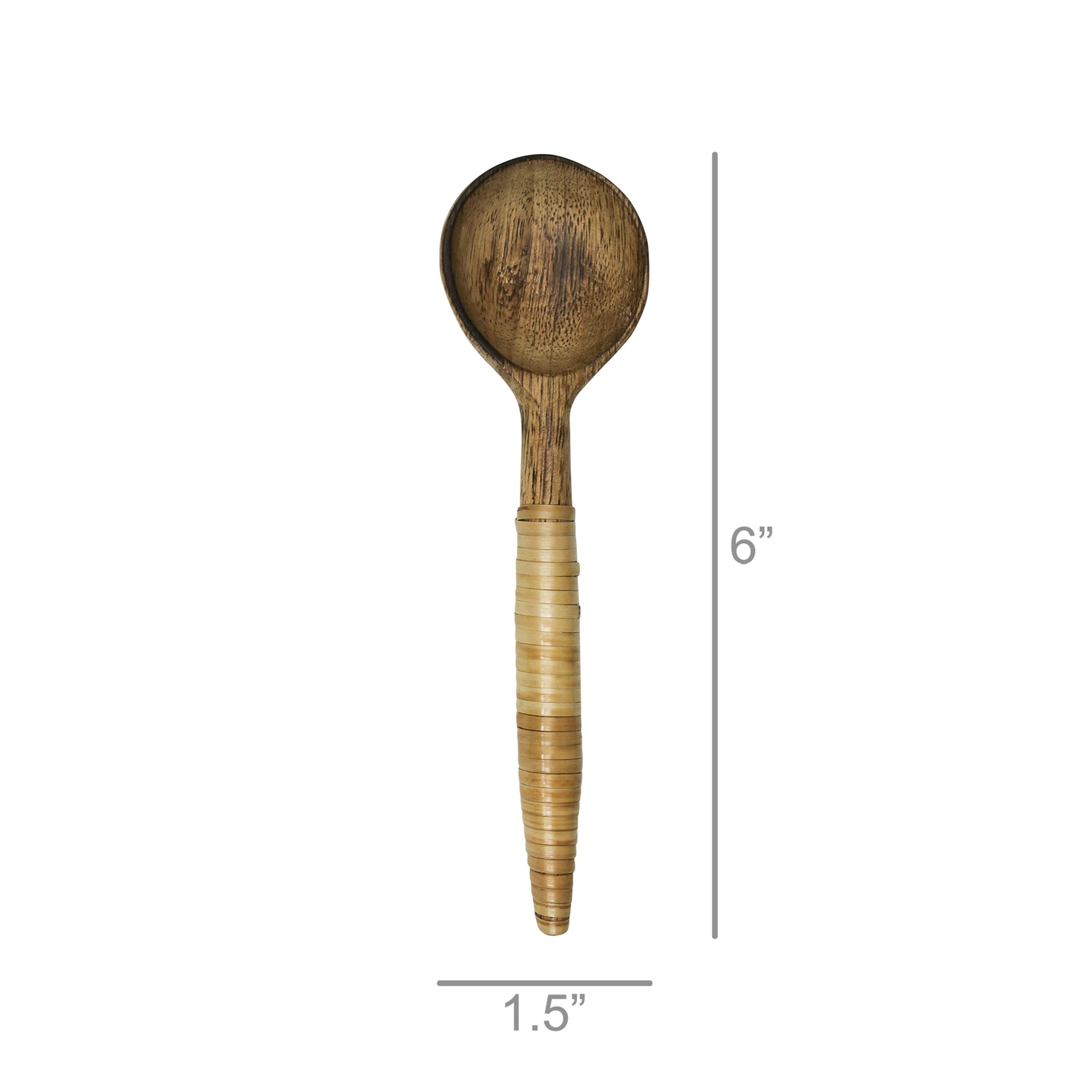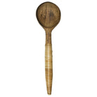 Richly grained mango wood is hand carved into minimal yet functional spoons with rattan wrapped handles. Hand wash is recommended. Handwash Only