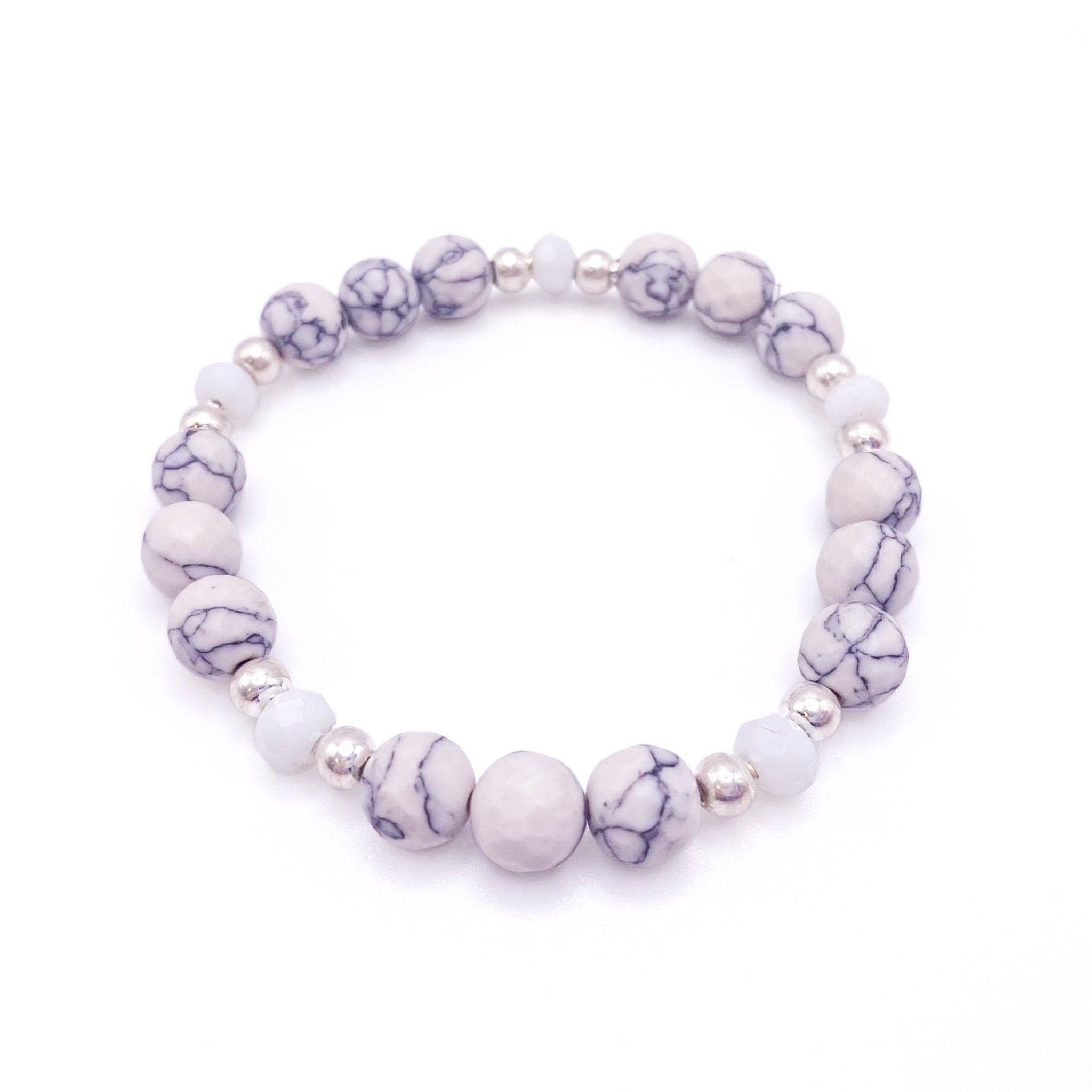 Kylie's Dream Bracelet adds a touch of elegant, understated style to any outfit. Crafted with white marbled howlite and silver beads, this stretch bracelet is designed to be comfortable and chic.