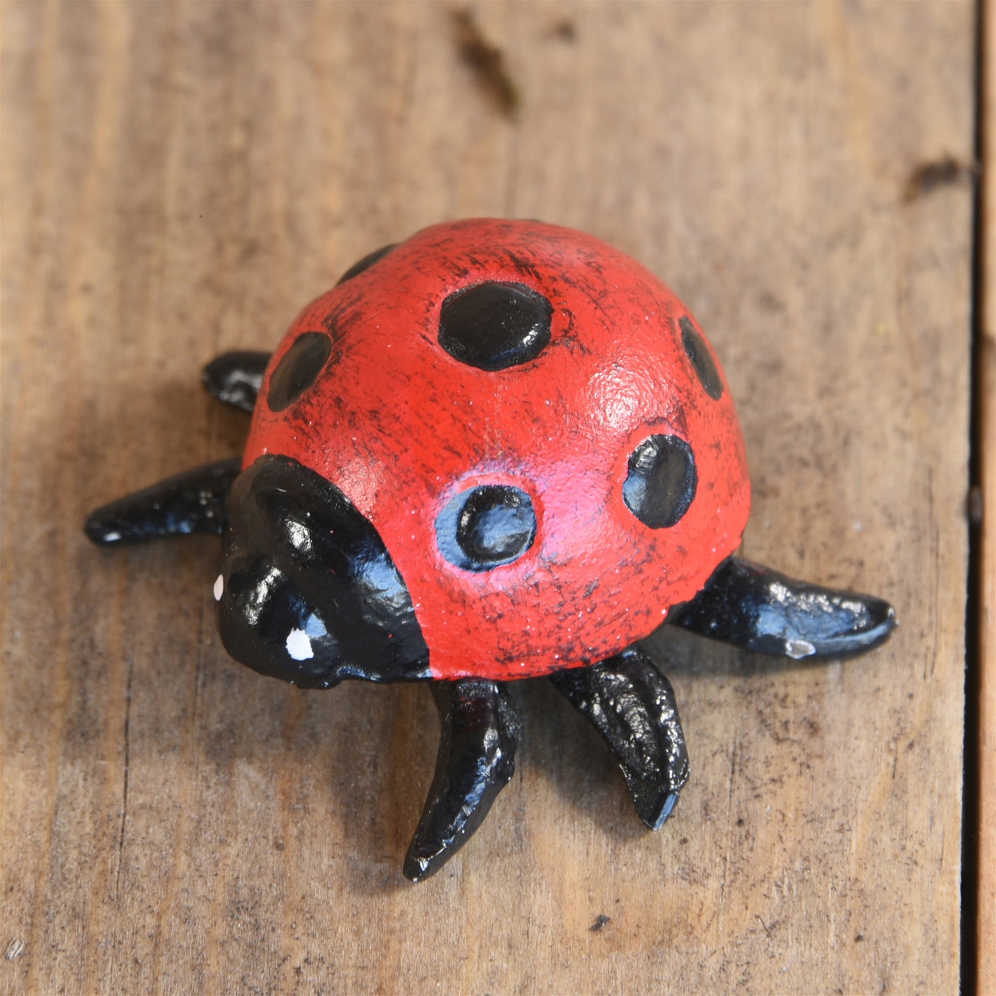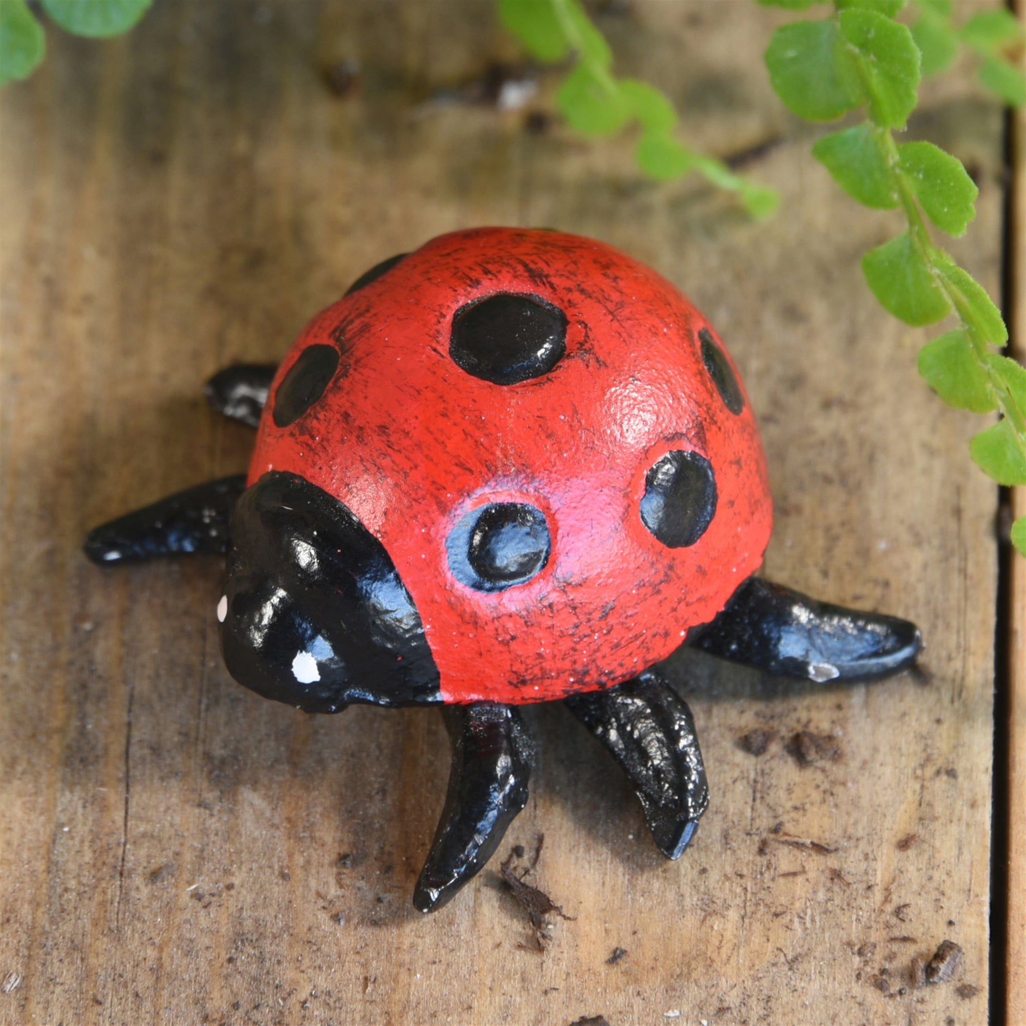 This petite ladybug figurine in crafted from cast iron featuring bright hand painted detail to offer a colorful accessory for the home and garden.