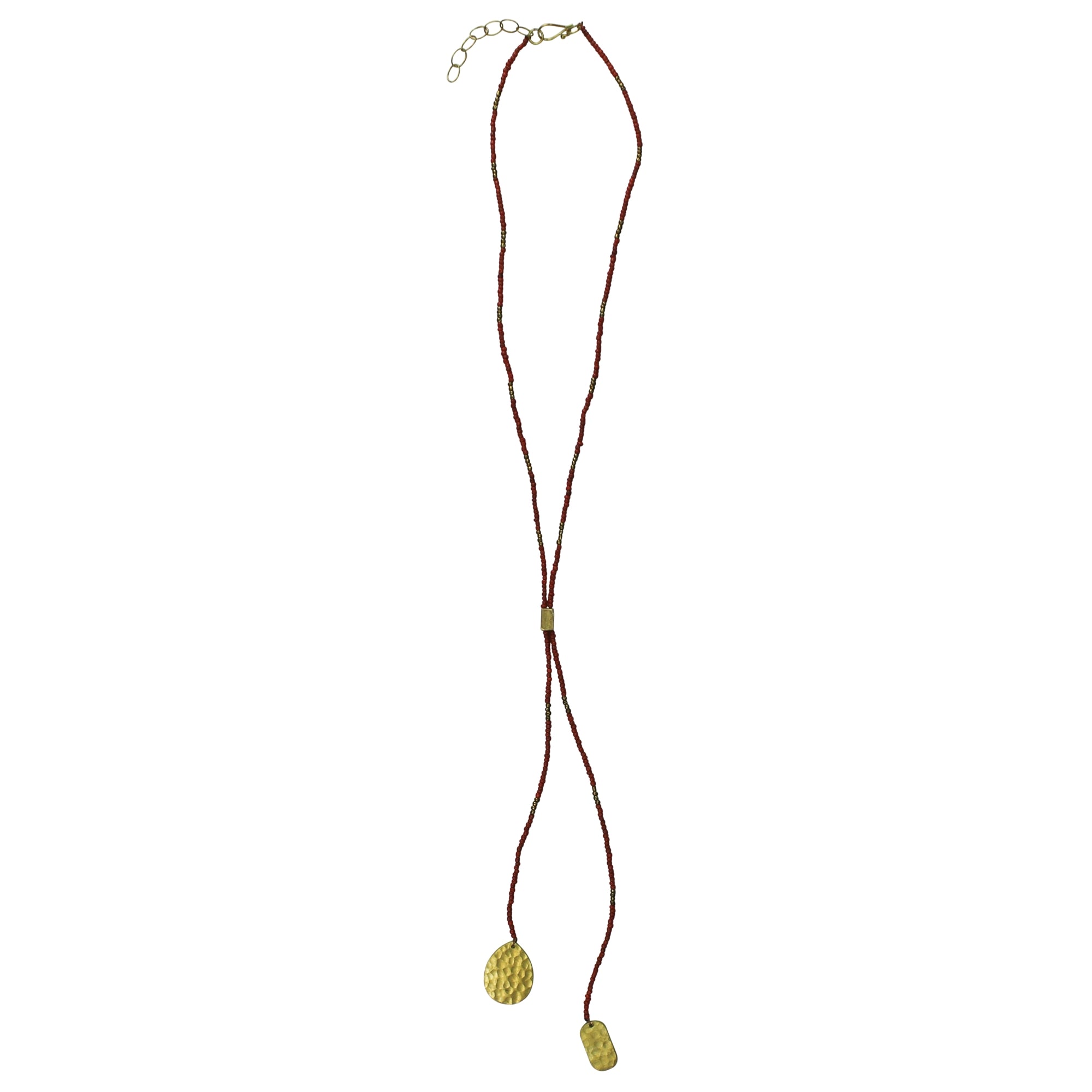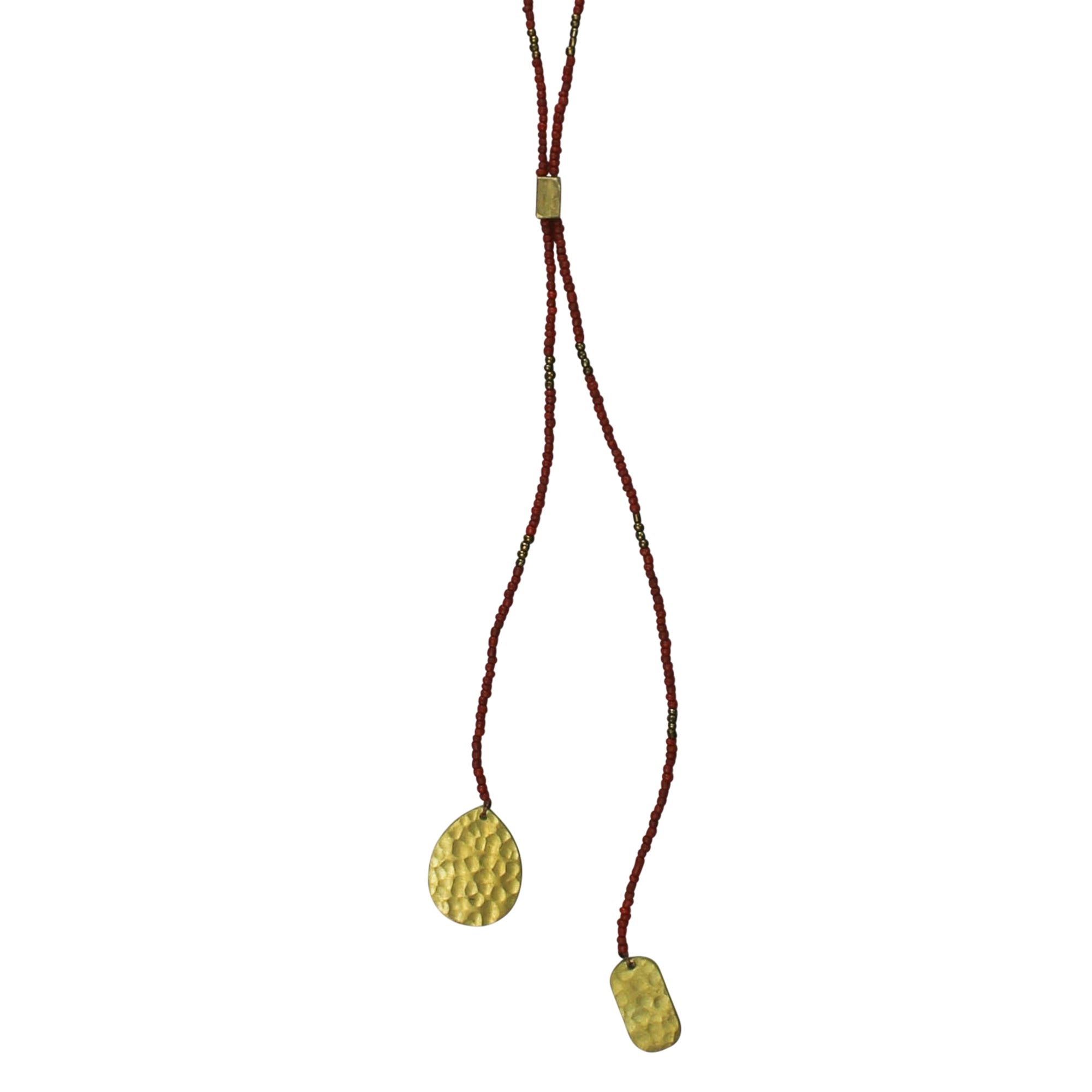 Elevate your style with our stunning Beaded Pendant Necklace. Handcrafted with rust colored beads and hammered brass accents, its understated design exudes timeless elegance for any occasion. 34” beaded strand, adjustable