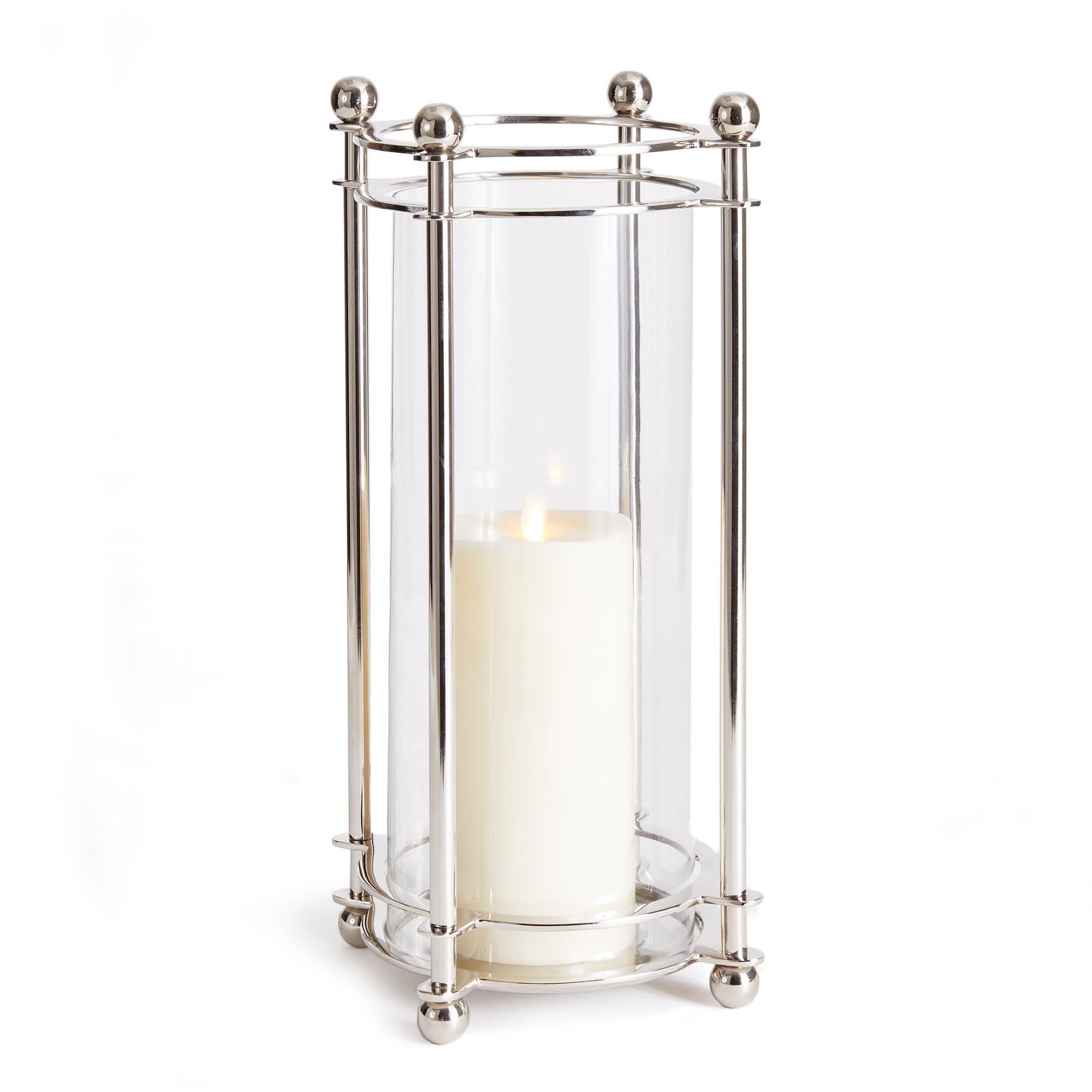 In a shiny chrome finish, this hurricane is a markedly handsome addition to your traditional decor. The cylindrical glass hurricane has a closed bottom to use also as a vase. A versatile piece, indeed!