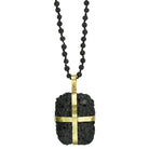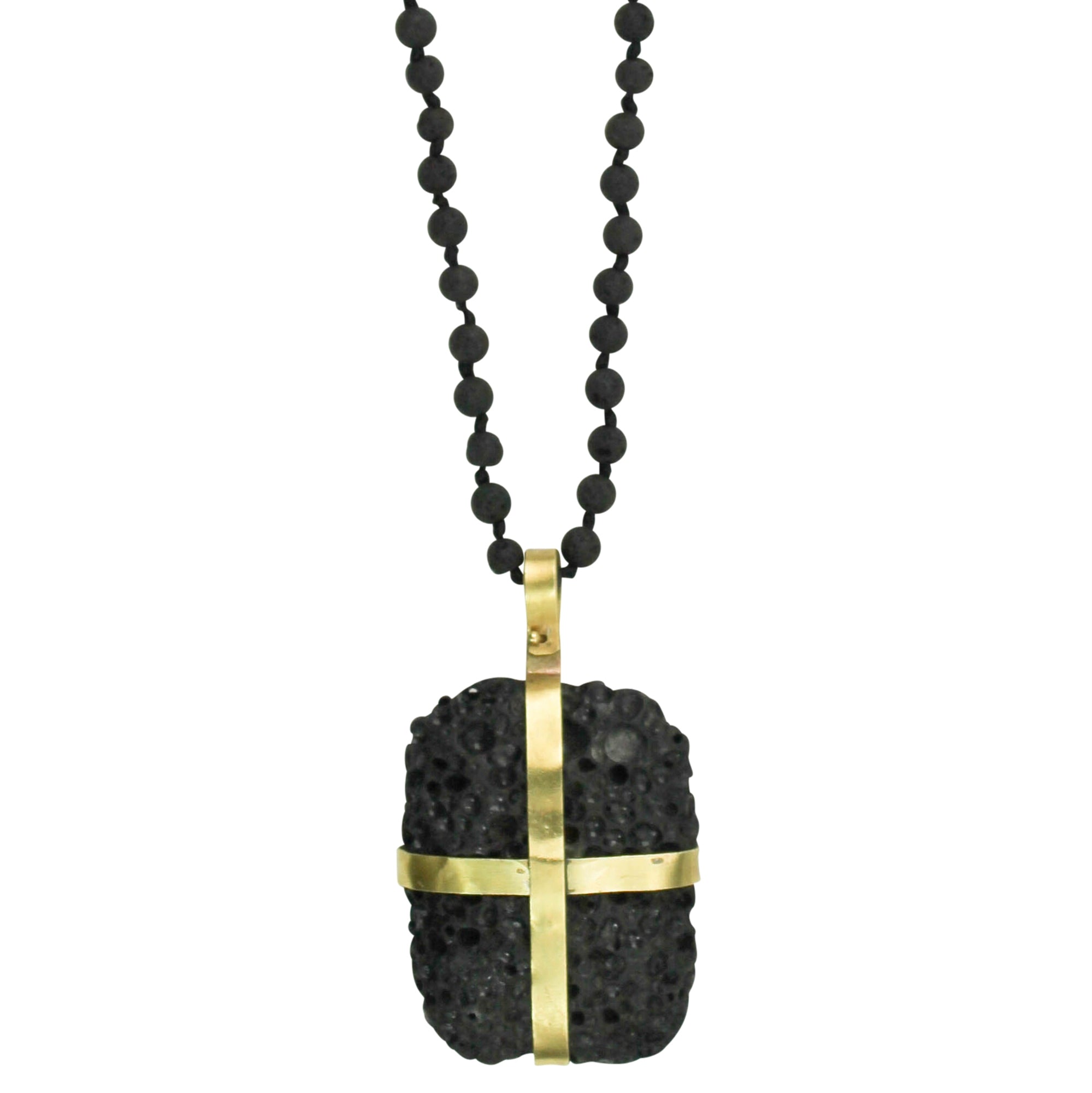 Organically formed squares and rectangles of lava are counterbalanced with crisp lines of brass. Thanks to the organic nature of this material each pendant will be unique. 1.75" pendant on 32" lava strand.