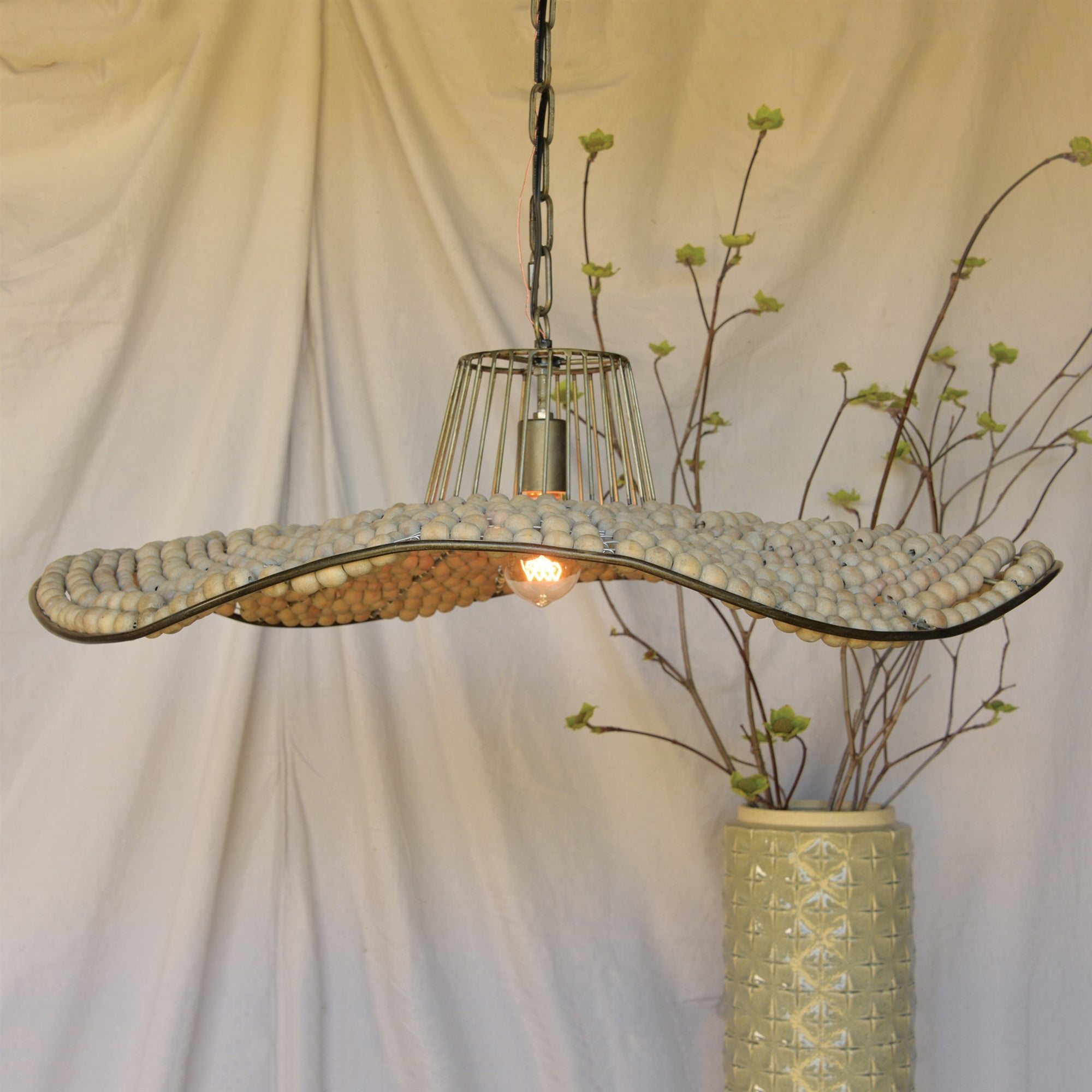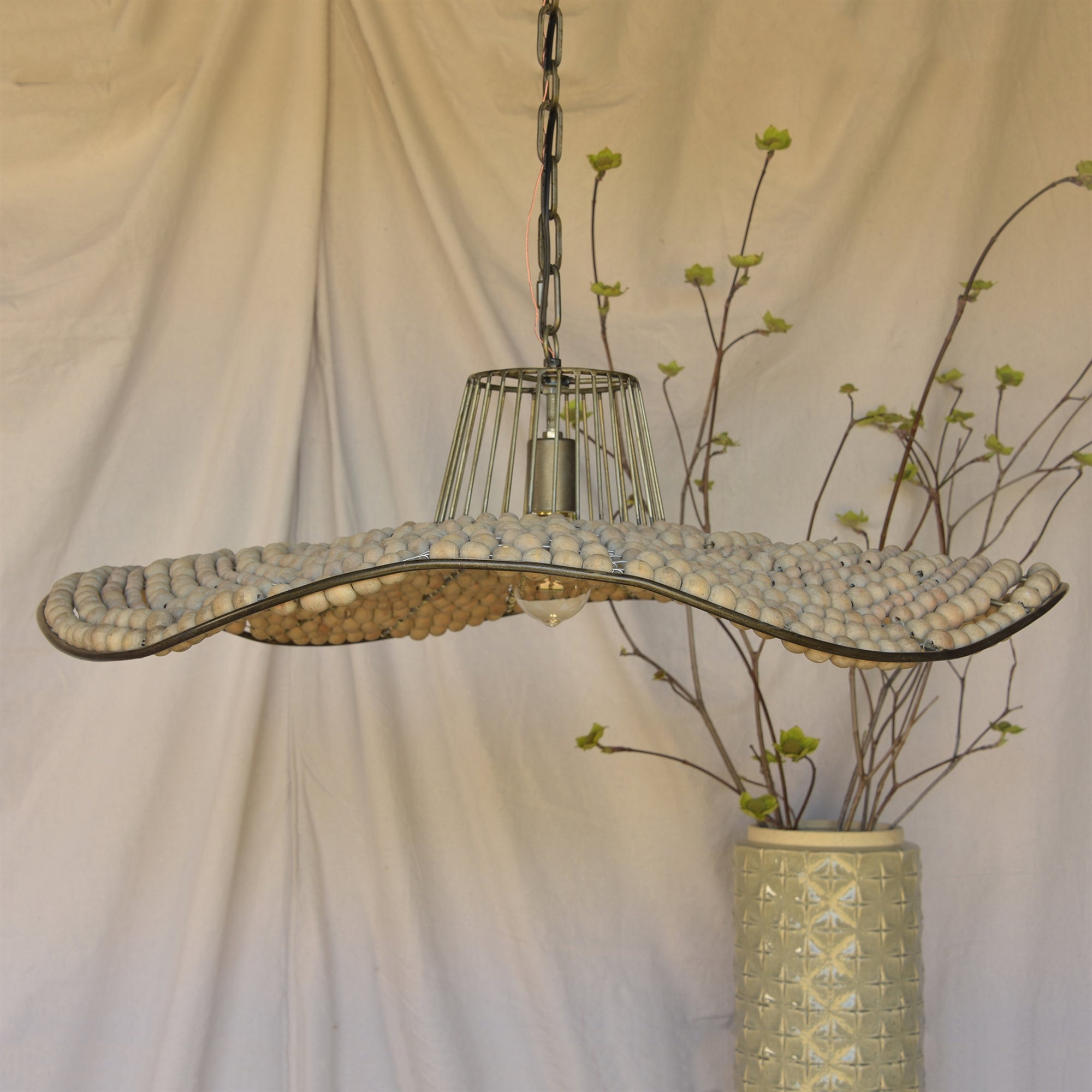 Natural wood beads are strung onto an organic frame to give a light and oscillating effect to this pendant lamp. Paying homage to the bohemian lifestyle, this piece finds a home as an artistic focal point to any space. Hardwired style. 5’ chain and 5