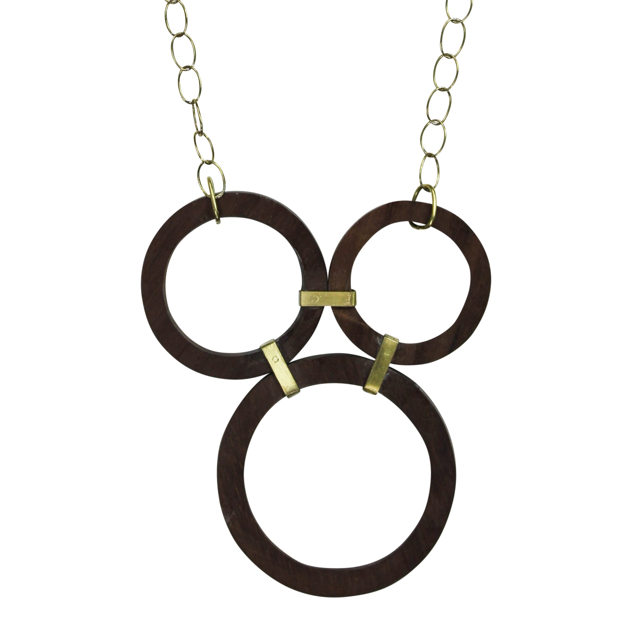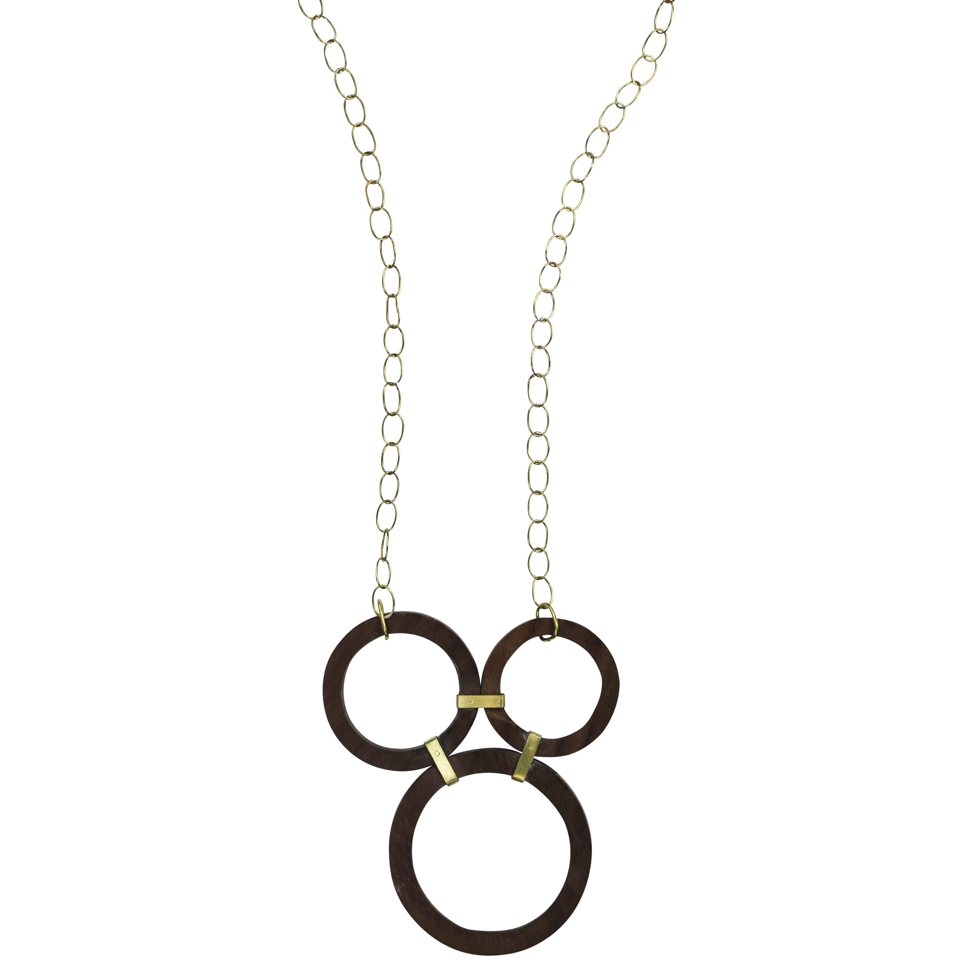 Circles of wood are bound together with brass creating a union of form that turns the simple round shape into a structural statement. The pendant hangs on 26” of adjustable brass chain. pendant on 26” of adjustable brass chain