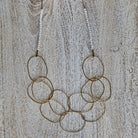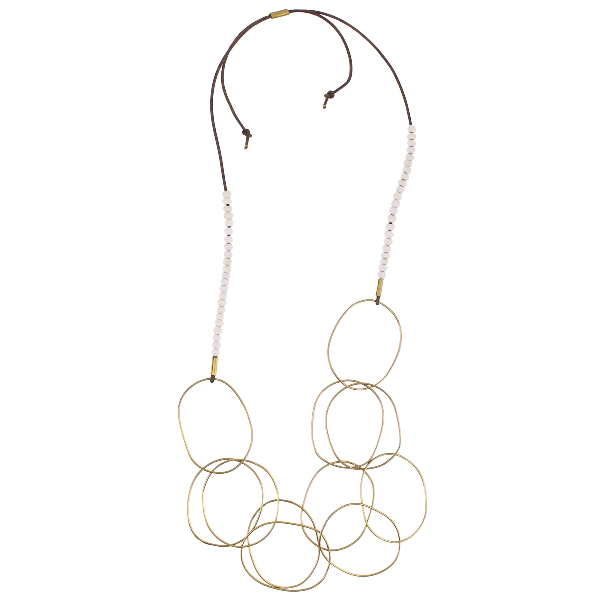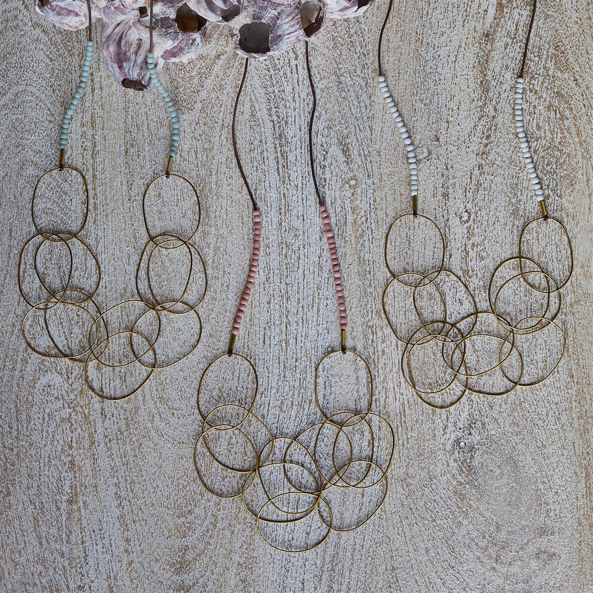 An elegant cluster of organically shaped oval brass loops are linked together and set the stage for a delicate pop of color with sea drenched tones of glass beads strung onto a soft, adjustable leather cord. 35"