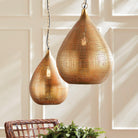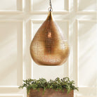This grand pendant is beautifully crafted to have a linen-like quality. The metal teardrop shape is formed of loosely woven metal strands pressed and seamlessly welded together. The result is a warm light that streams softly through the tiny openings. A show-stopping feature for entryway, foyer or kitchen island.