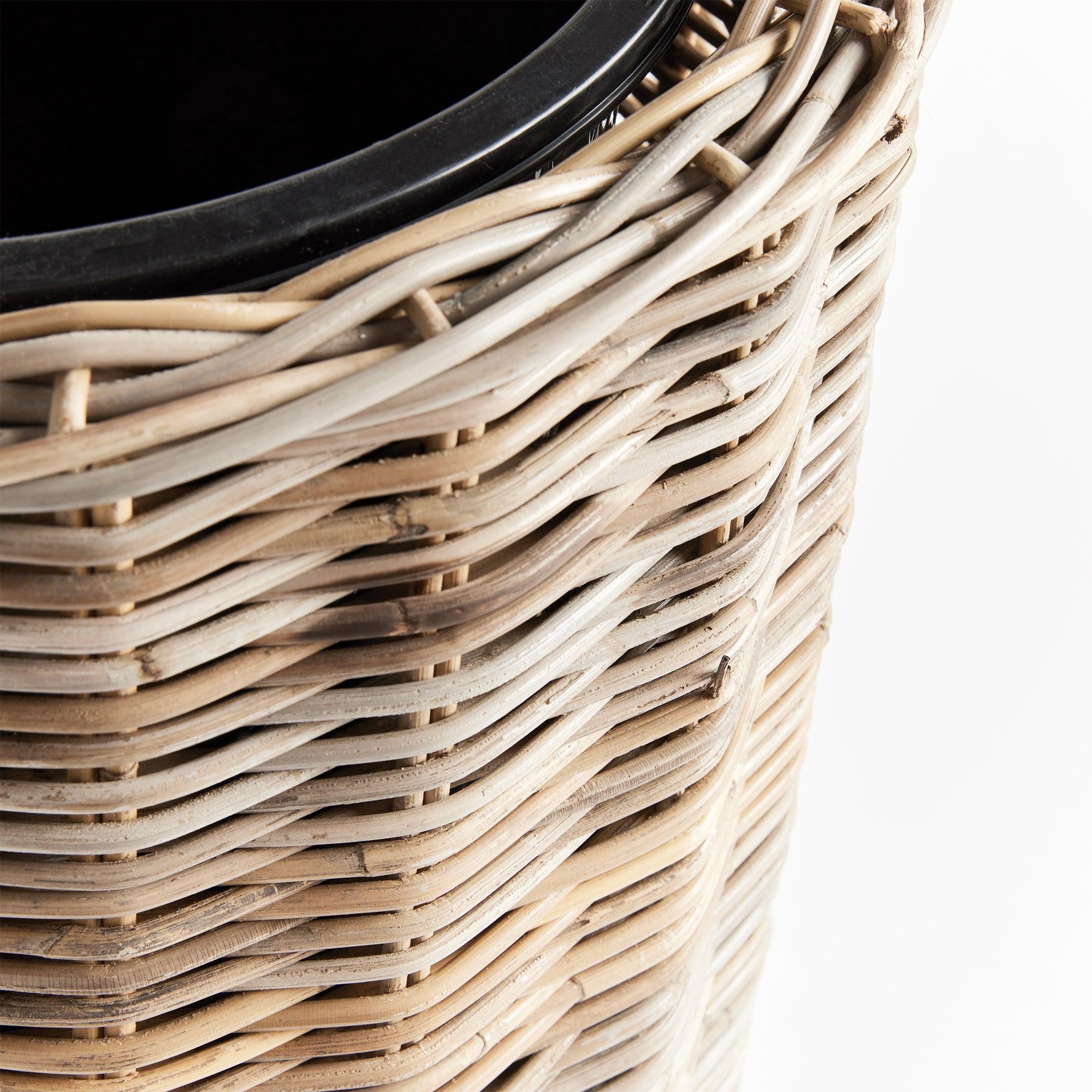 The all-natural varied tones are the beauty of this woven planter. Designed with a flattened weave and complete with grower's pot that sits on an iron frame. A treasure of a planter for the rattan lover.