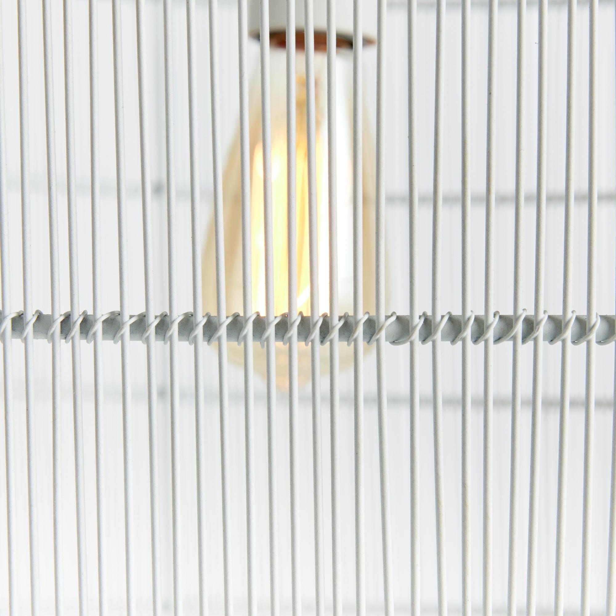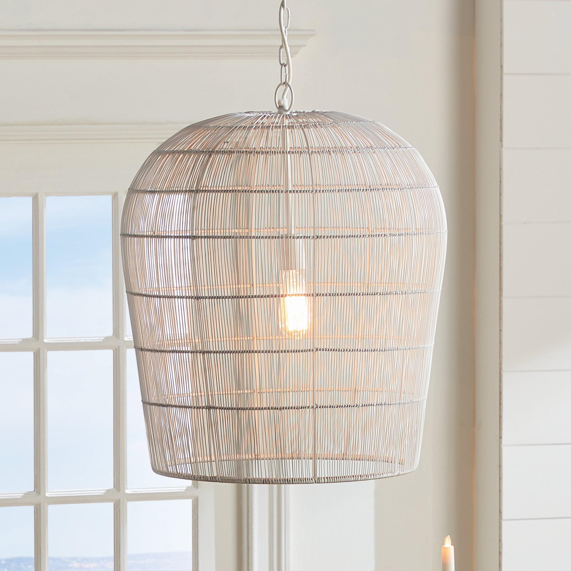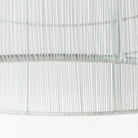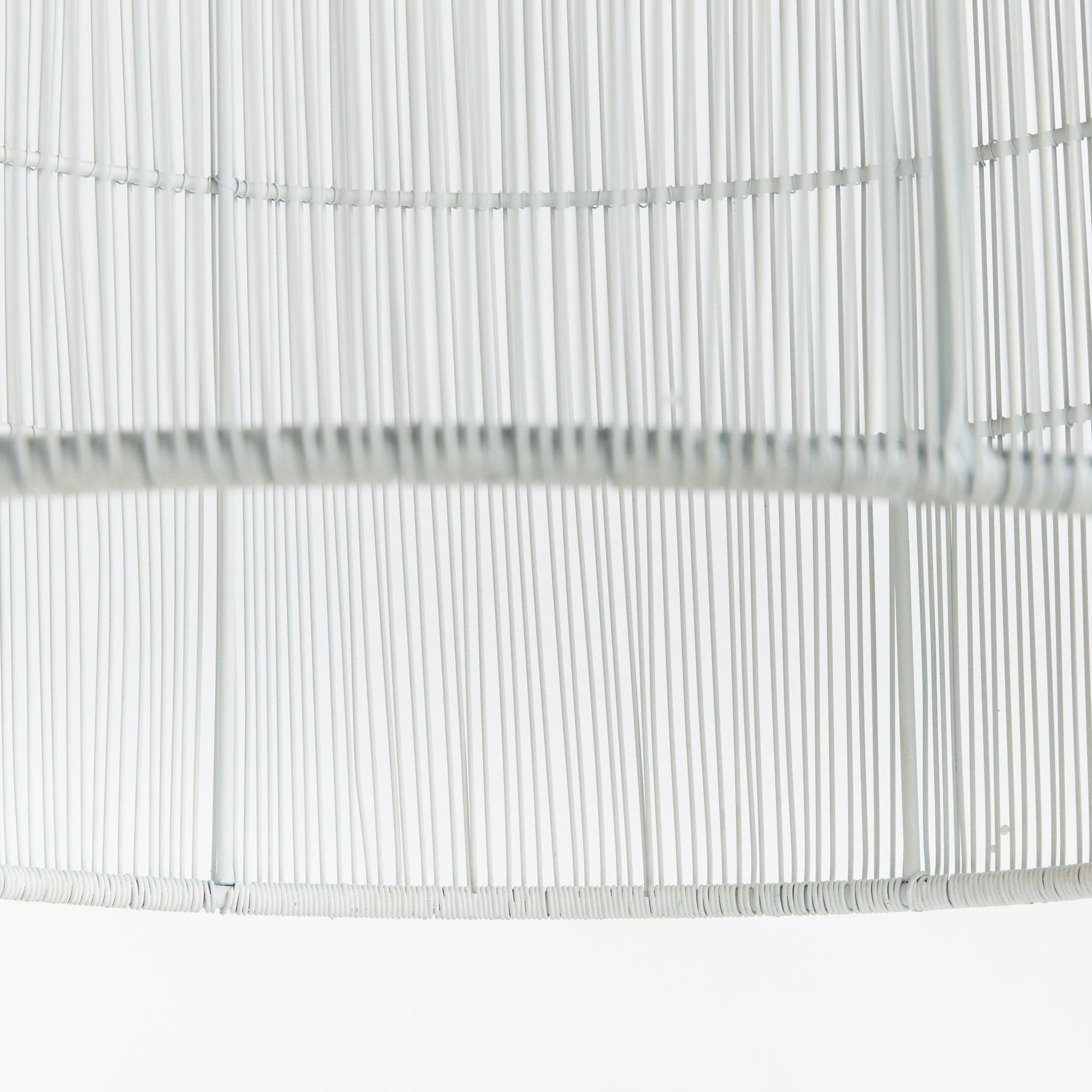 Delicate white matte metal strands are tightly woven around a solid iron frame in grand scale. The open spaces create a symphony of light. Perfect for kitchen island or foyer.