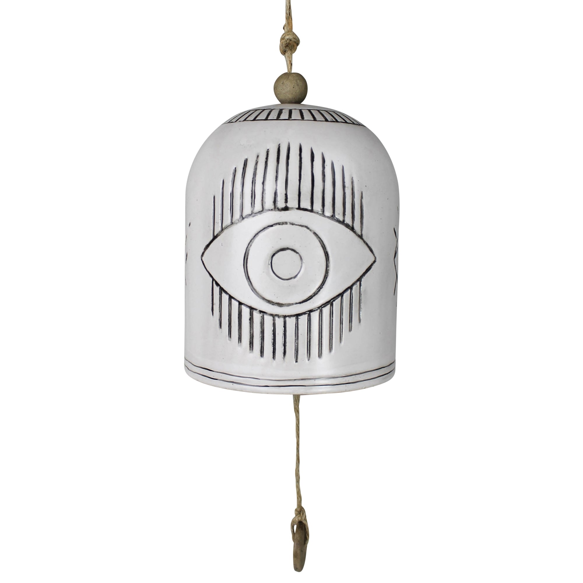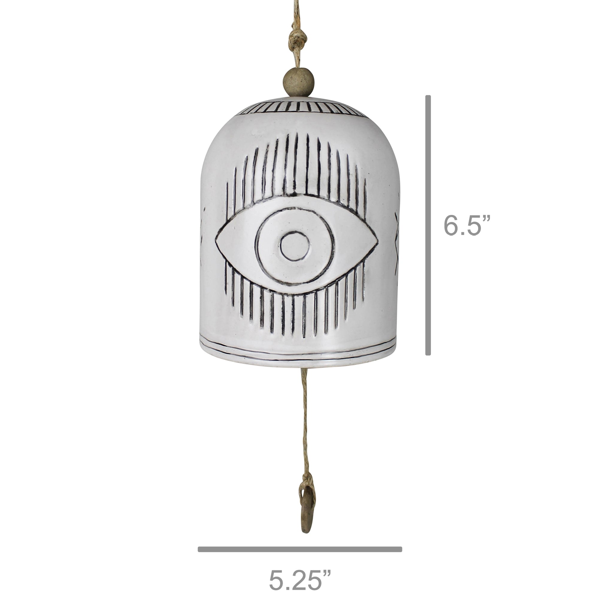 Our ceramic bells add a touch of calm to the home or garden, finished in a matte white glaze with a debossed pattern of three different eyes each bell gives off a pleasing sound when struck with the ceramic clapper. Hangs from a 12” length of jute.