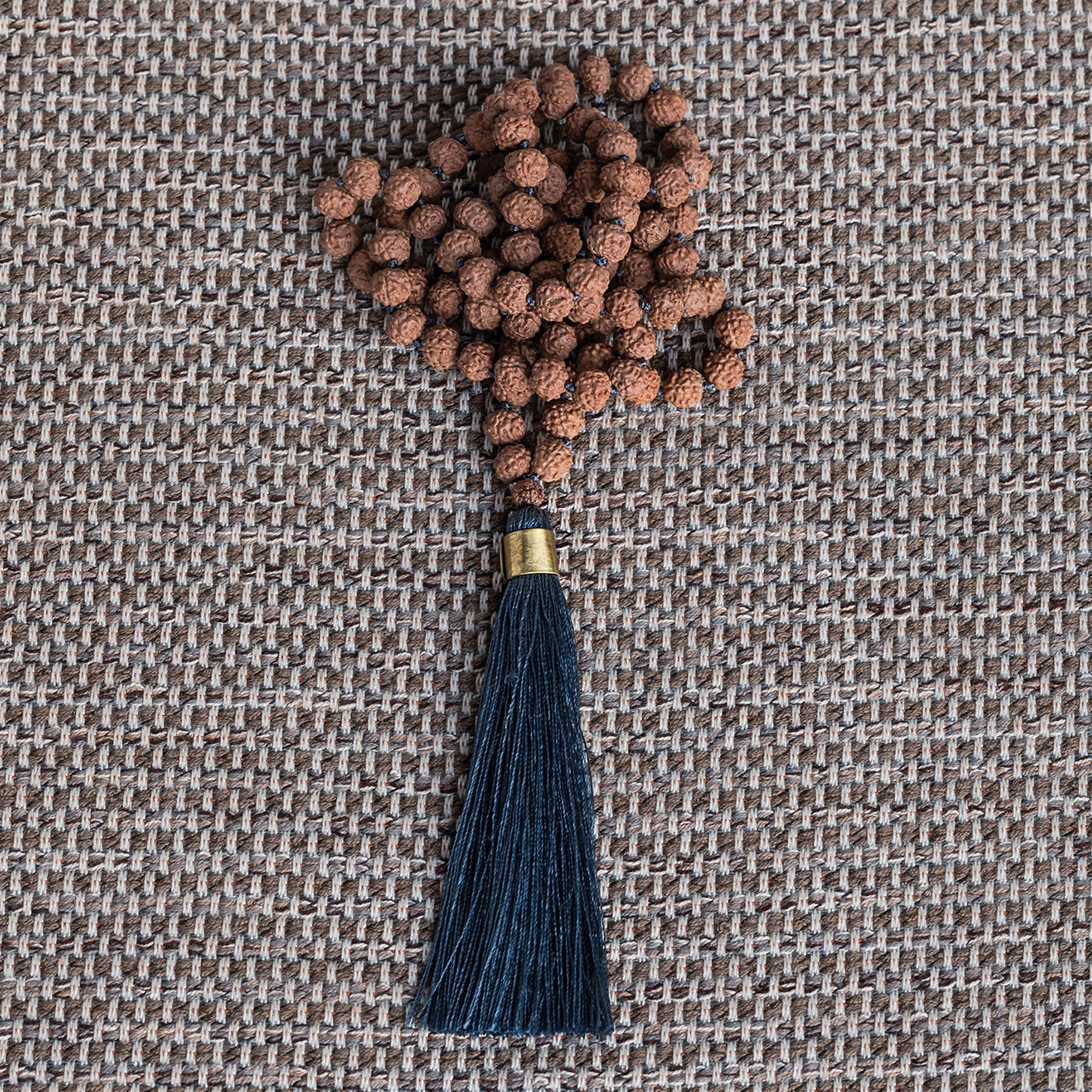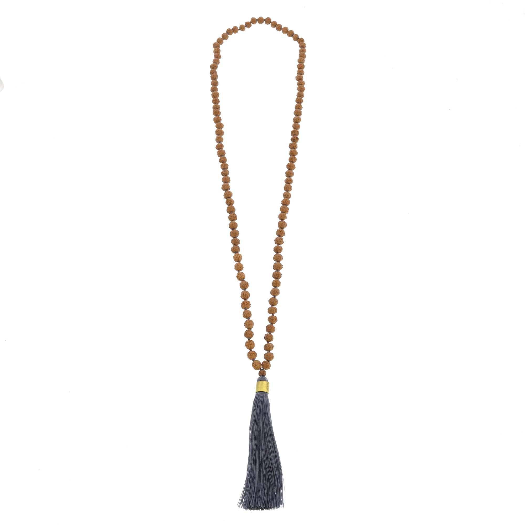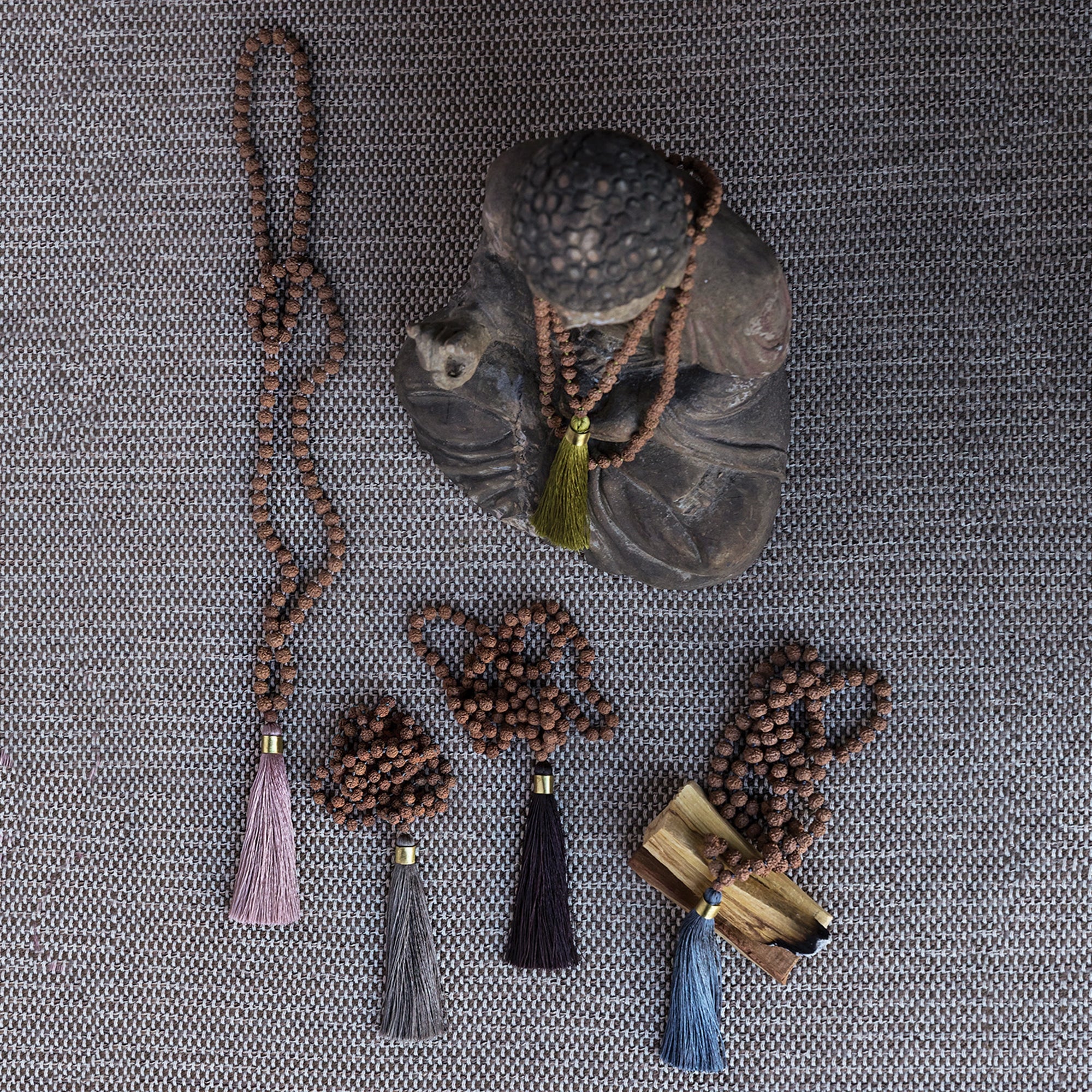 Soft and fluid synthetic silk tassels dangle from a hand-tied mala bead strand and are bound with a brass cuff. Adjustable. Mala colors may vary.