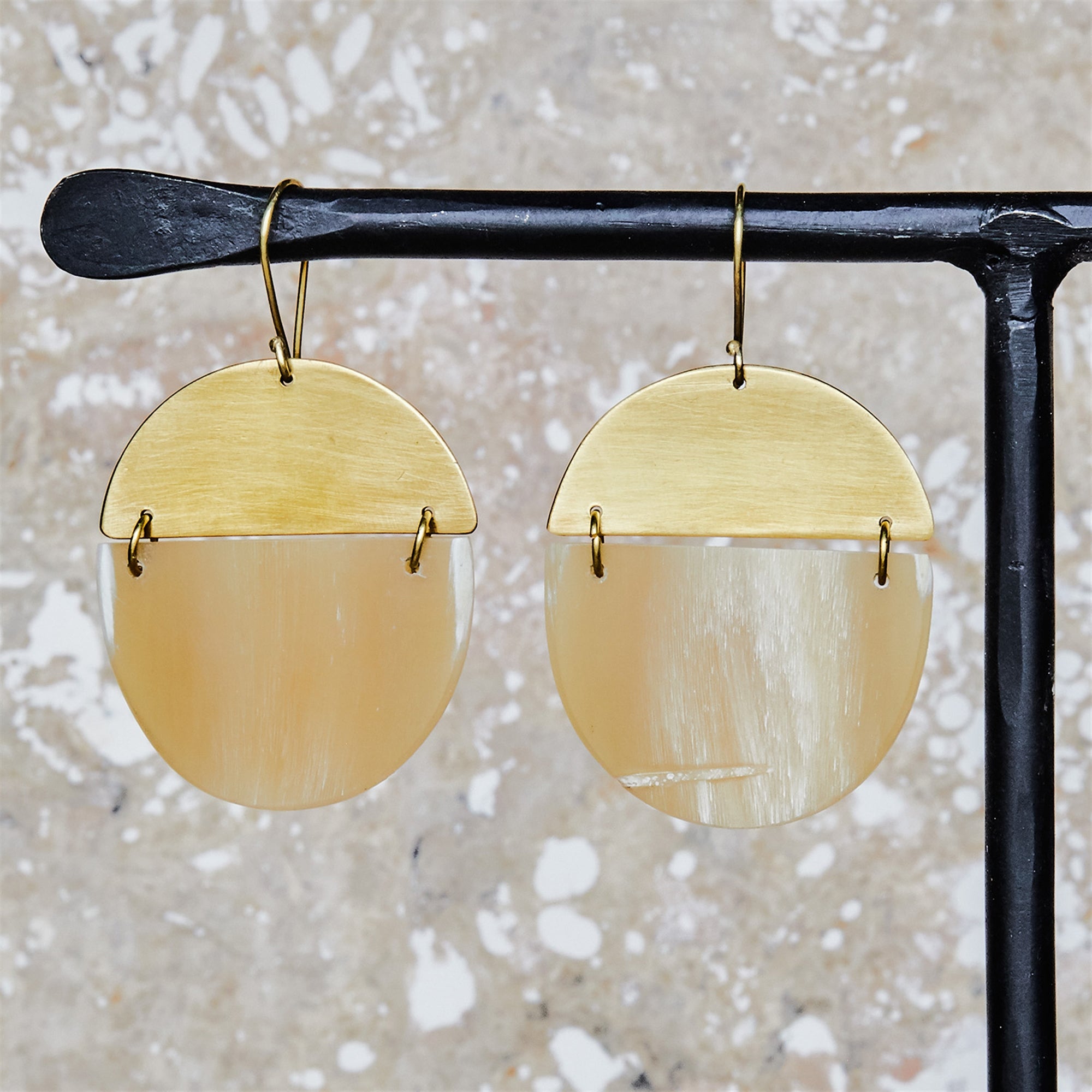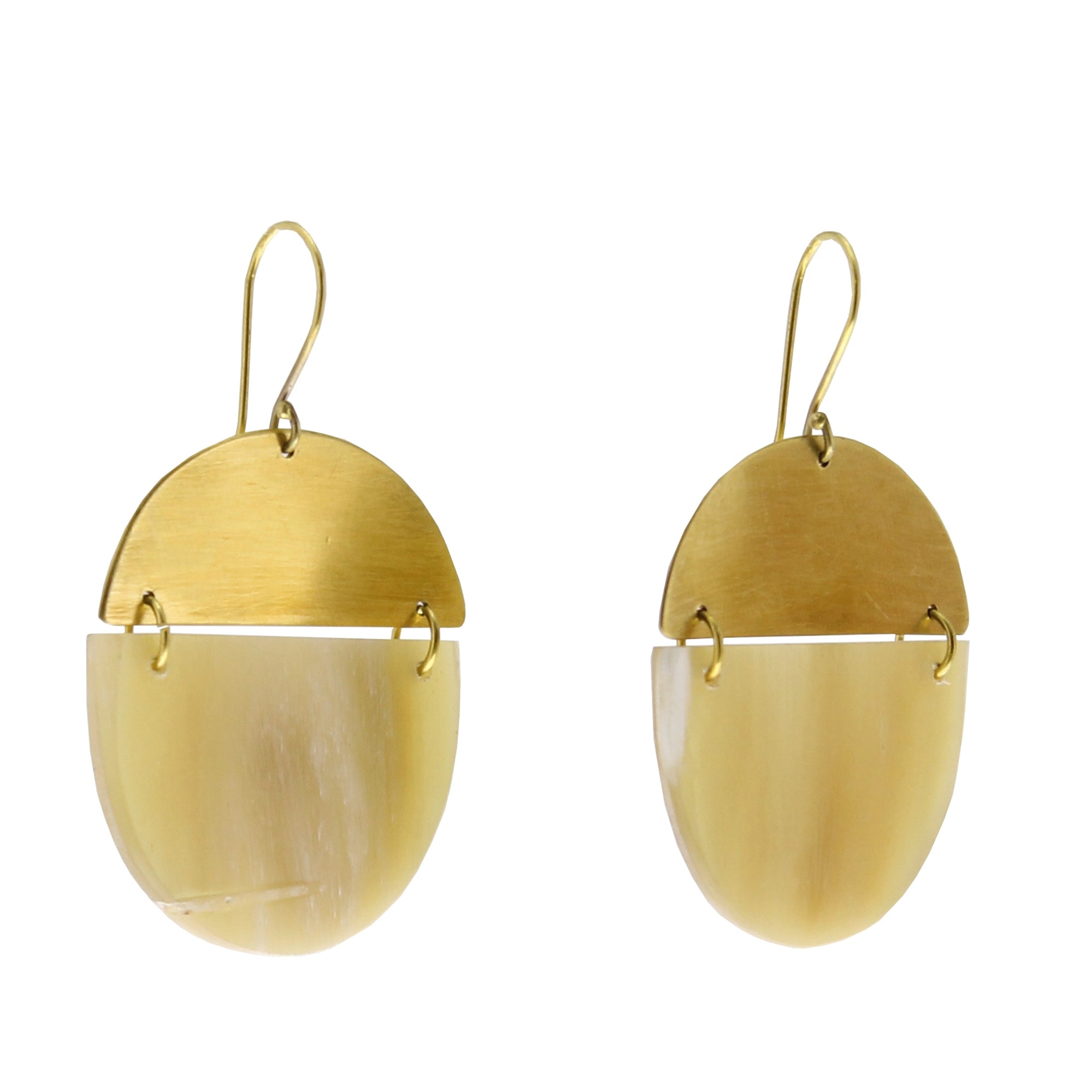Half circles of brass and horn are linked to create fluid forms with graceful movement. 1.5"x2.25"