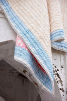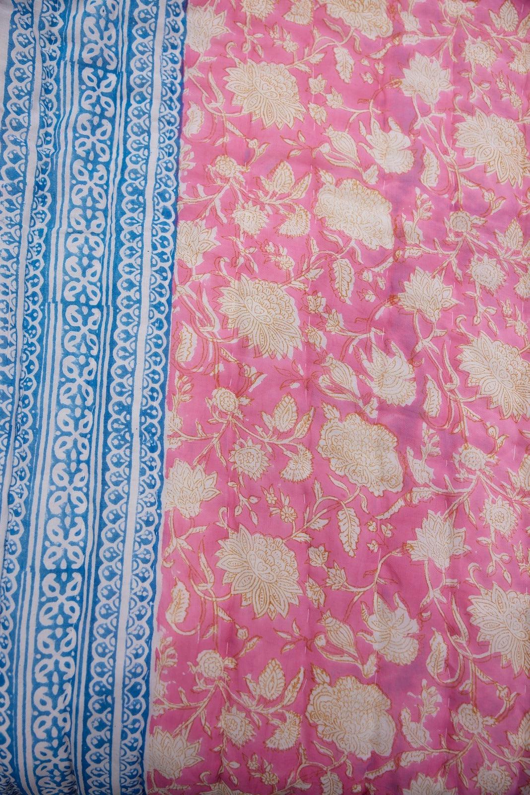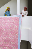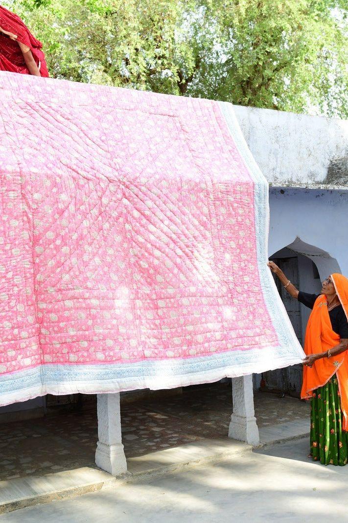 The design is hand-pressed onto each quilt using hand-carved wooden blocks dipped in dyes. The printed cotton shells are brought to the homes of quiltmakers, who stuff and stitch the quilts by hand, creating the final product.