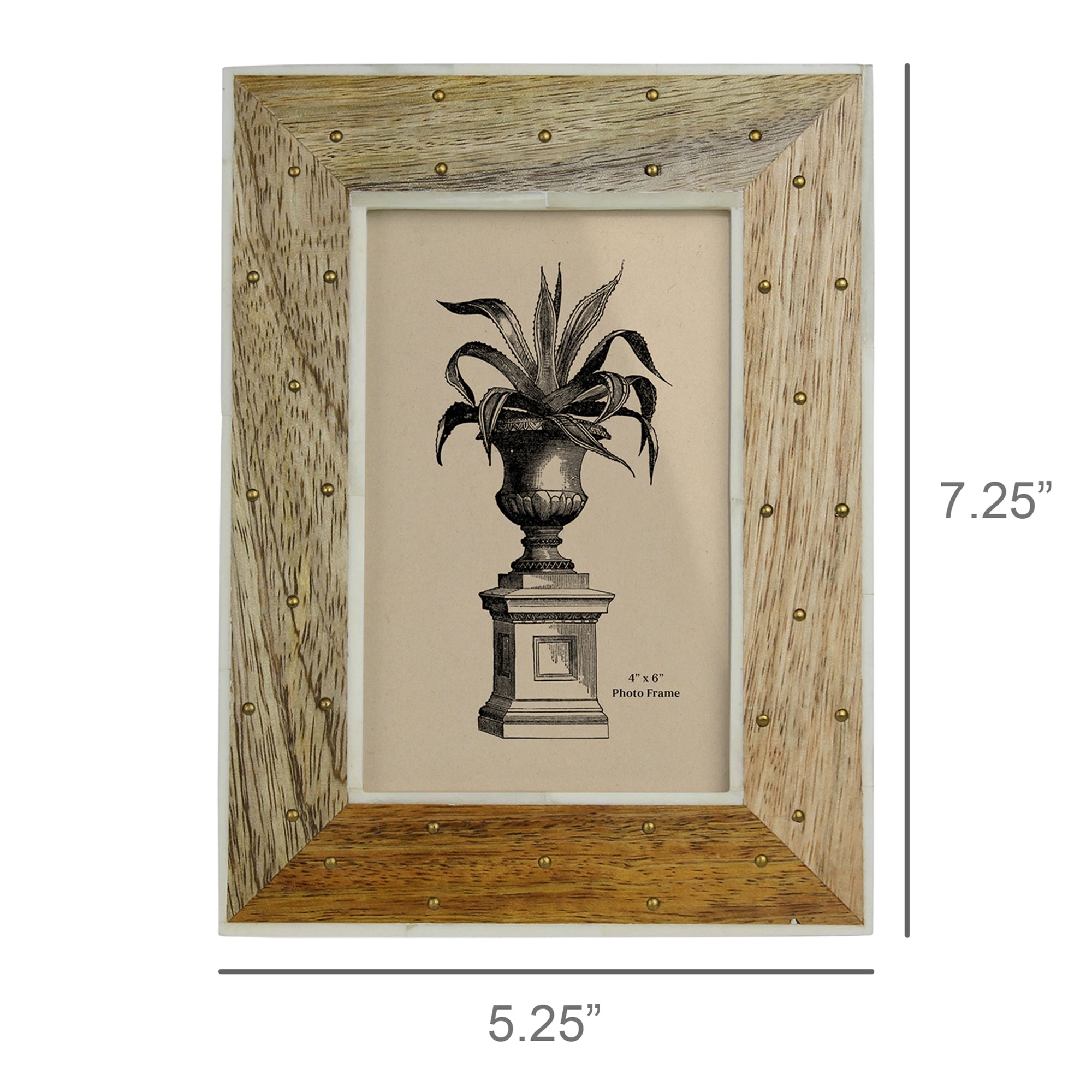 Printed photo memories have found their home in this unique picture frame. Thoughtfully crafted from mango wood, natural bone and brass, this frame is designed to fit any home's aesthetic.