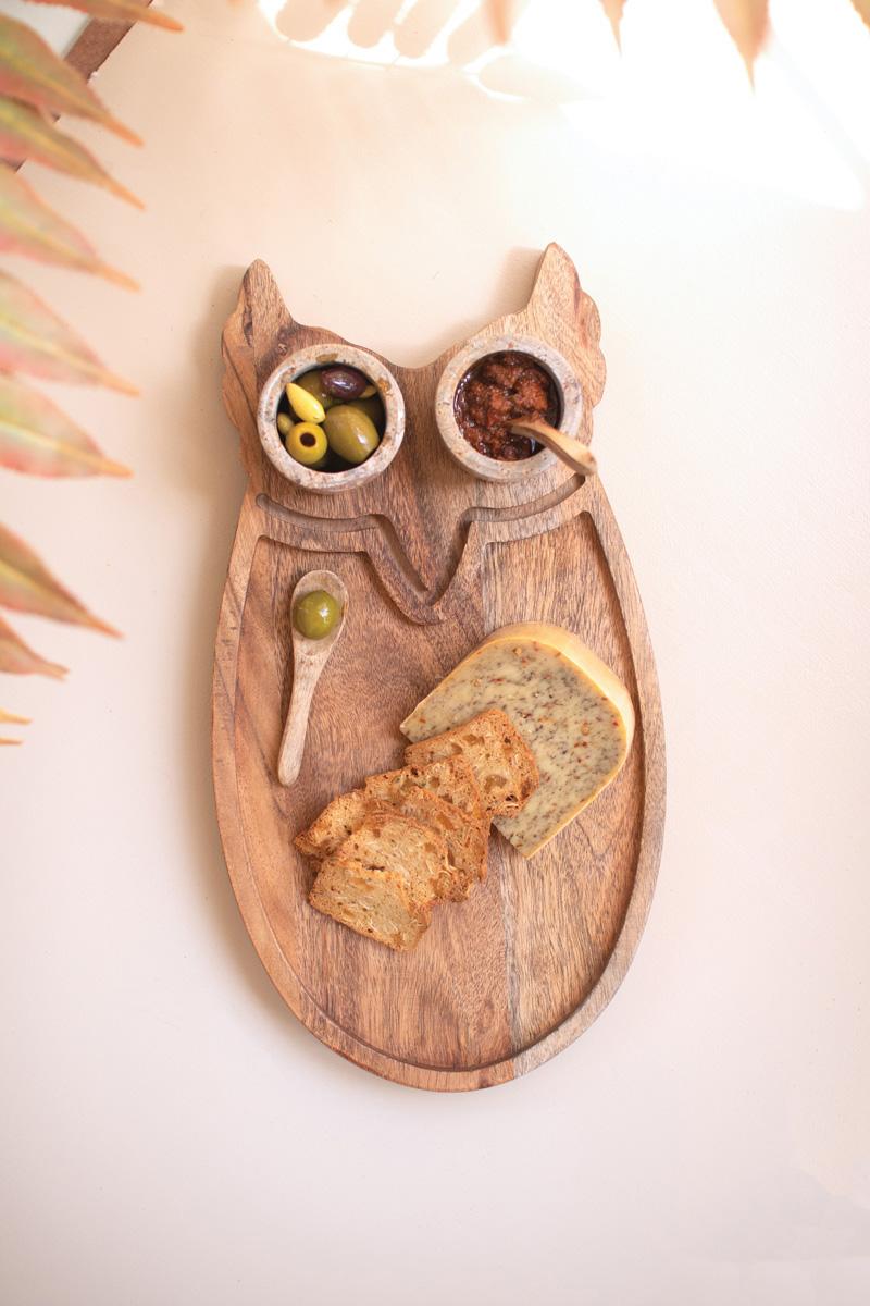 Marble And Wood Owl Cheese Board W 2 Bowls And 2 Spoons (Pack Of 2)
