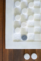 This marble checker set is not for young ones as it contains small pieces. Grownups can enjoy a good game or a handsome exhibition piece. Black and white pieces dress a white marble board.