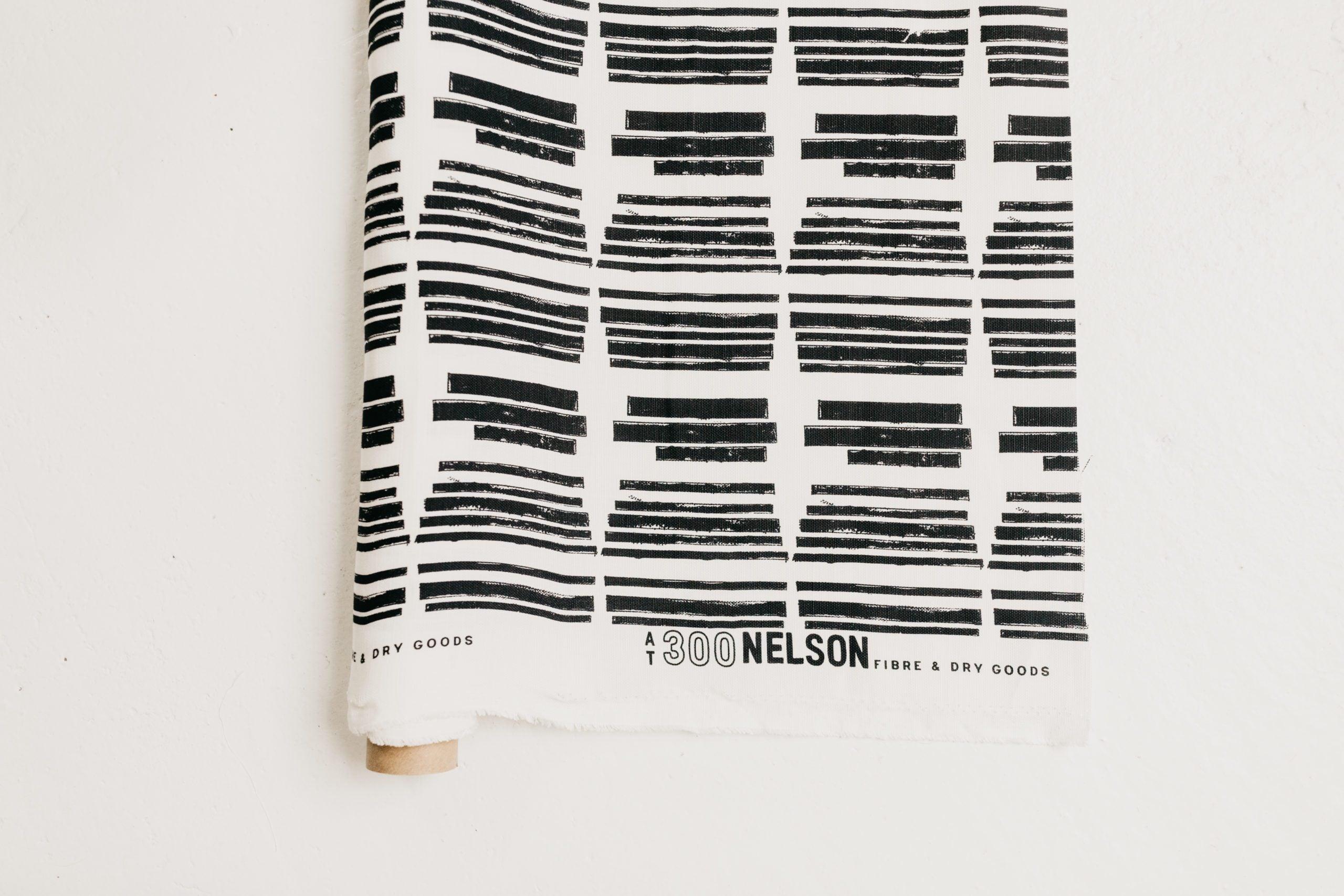Reading between the lines or just outside of them. Marguerite is printed on a certified linen and cotton blend from Belgium. The repeat is 7" X 5".