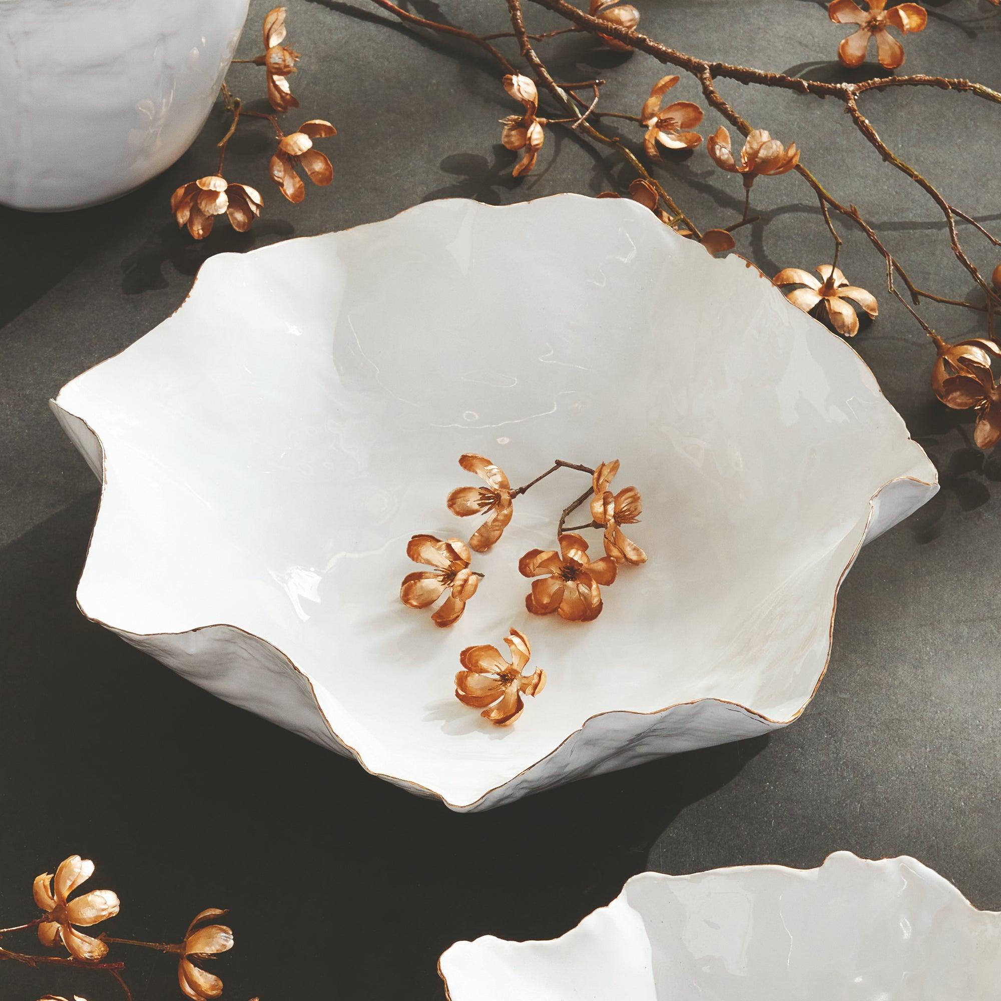 With crimped edges and natural form, this decorative tray is a real statement-making centerpiece. The hand-brushed gold tipped edges are electroplated for shine and durability. Place atop a few art books on coffee table, or on a side table for a stunning look.