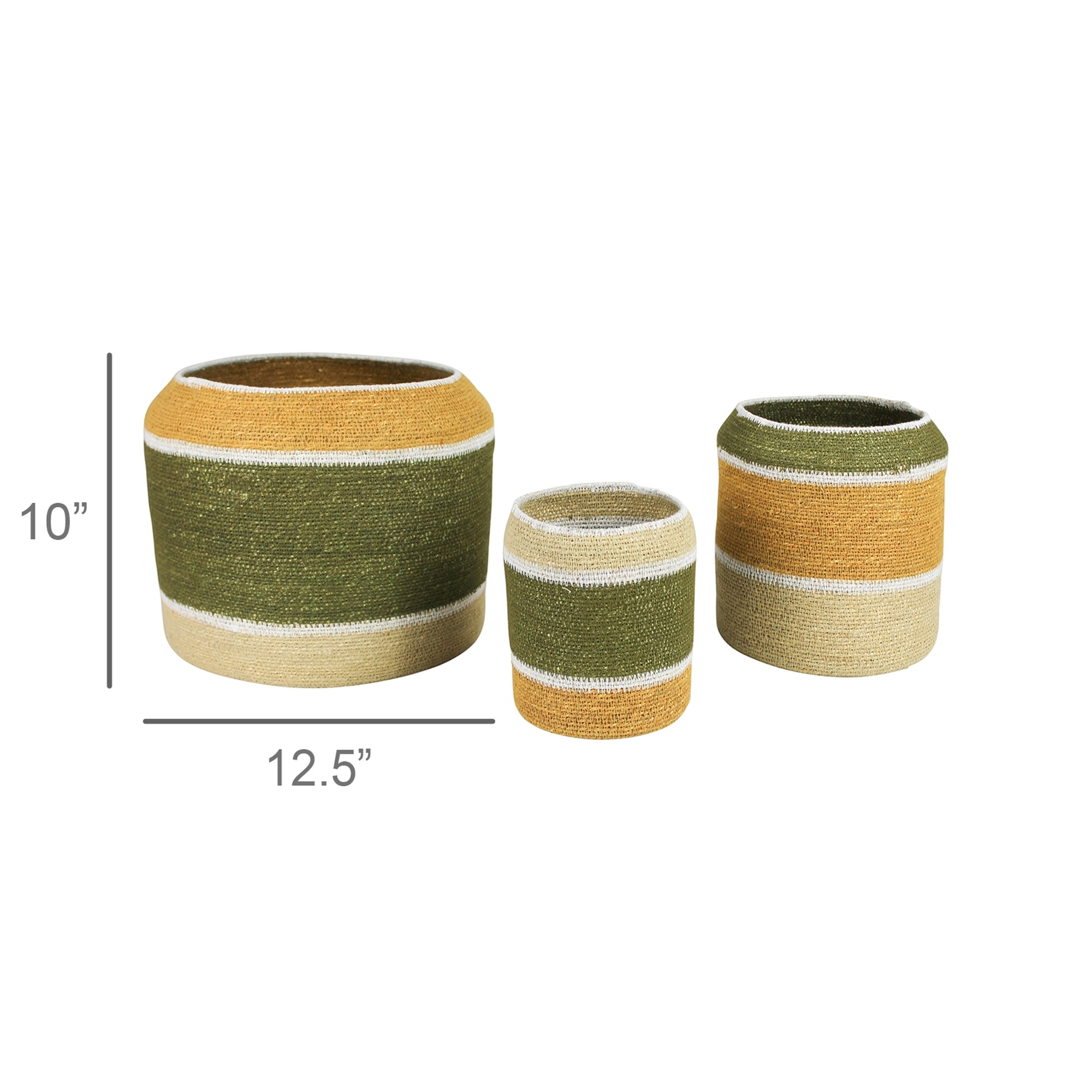 This set of 3 earth-hued seagrass woven baskets are stitched with cotton to offer understated shapes and sizes designs to add style and function to the home. Organize clutter, shoes or toys with an artisan aesthetic. Set of 3: $24, $25, $26, Sm: 6x6x6.5, Med: 8.5x8.5x8.5, Lrg: 12.5x12.5x10
