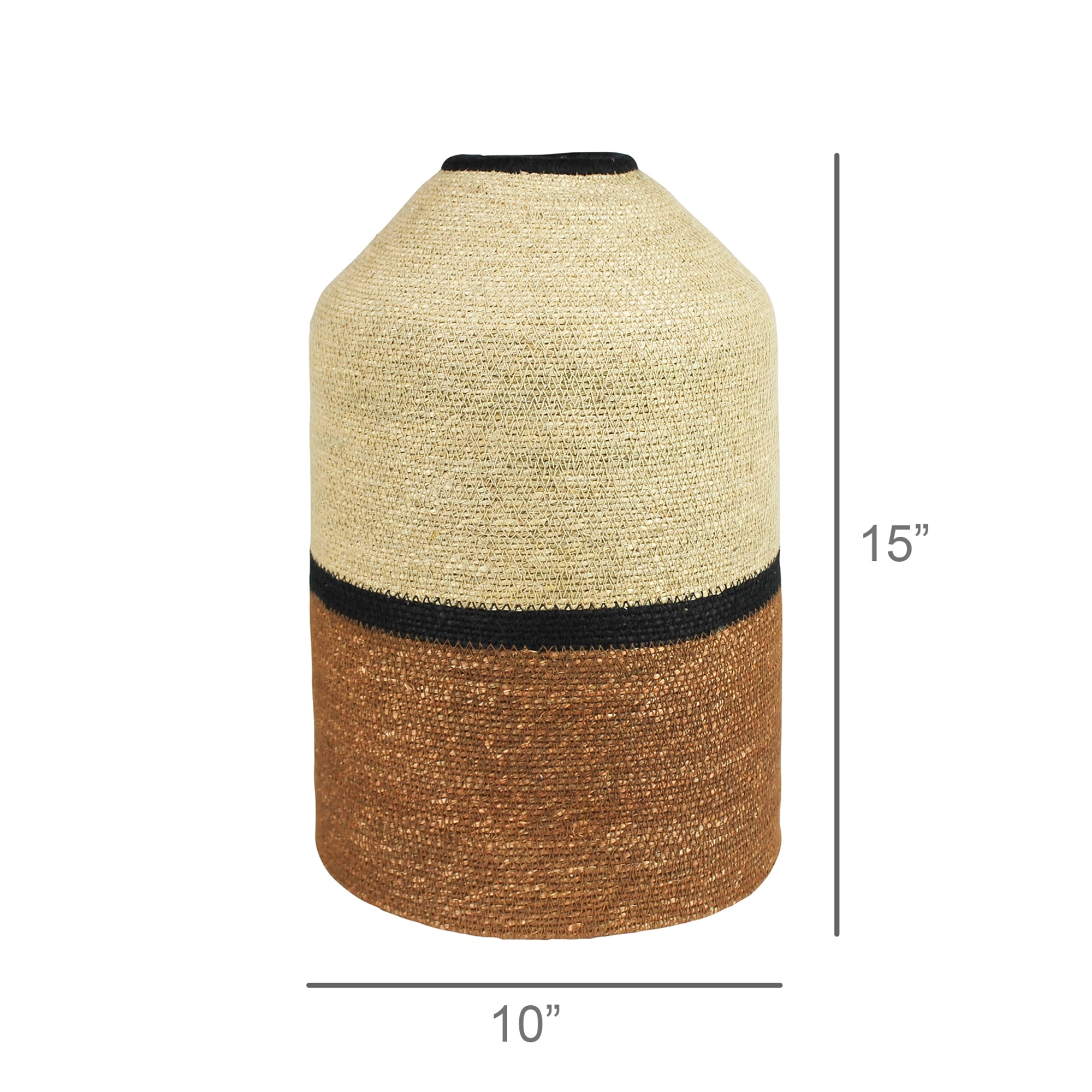 This earth-hued seagrass woven urn is stitched with cotton to offer an understated shape and size that is designed to add style and function to the home.