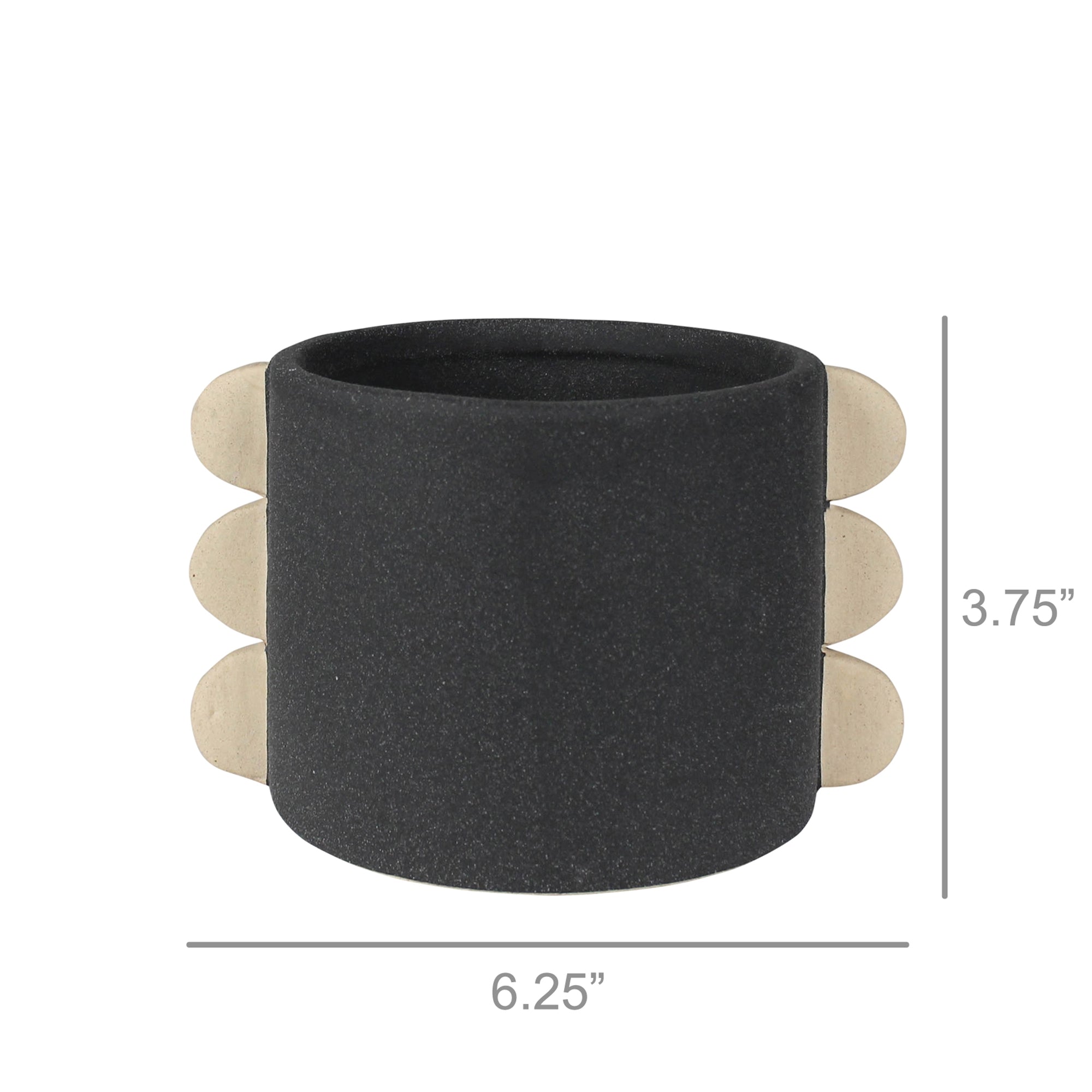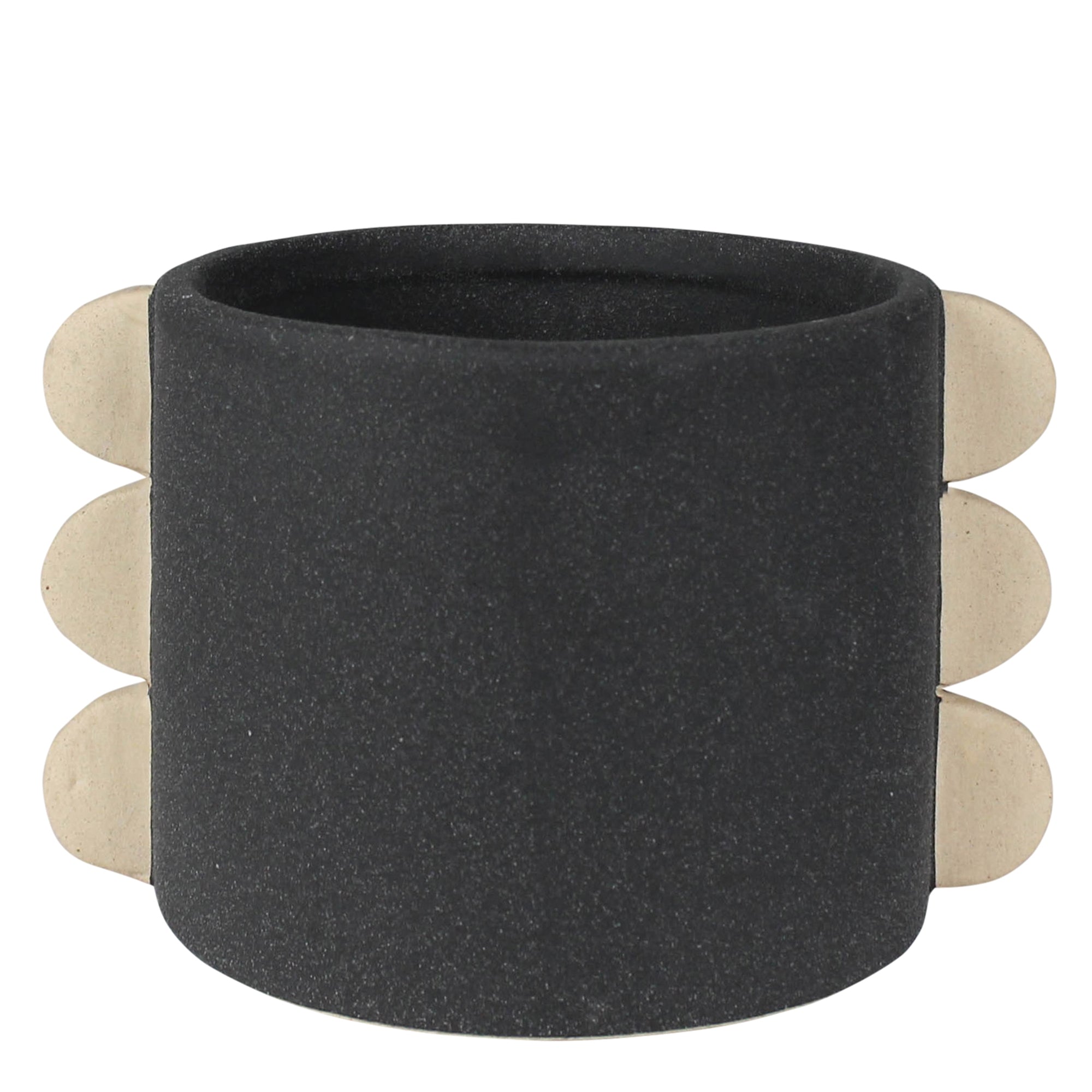 This global-chic cachepot in duo tone matte ceramic and stand-out statement side detail is in the perfect palette to be filled with a colorful potted plant. Sized for 4” drop-in pot.