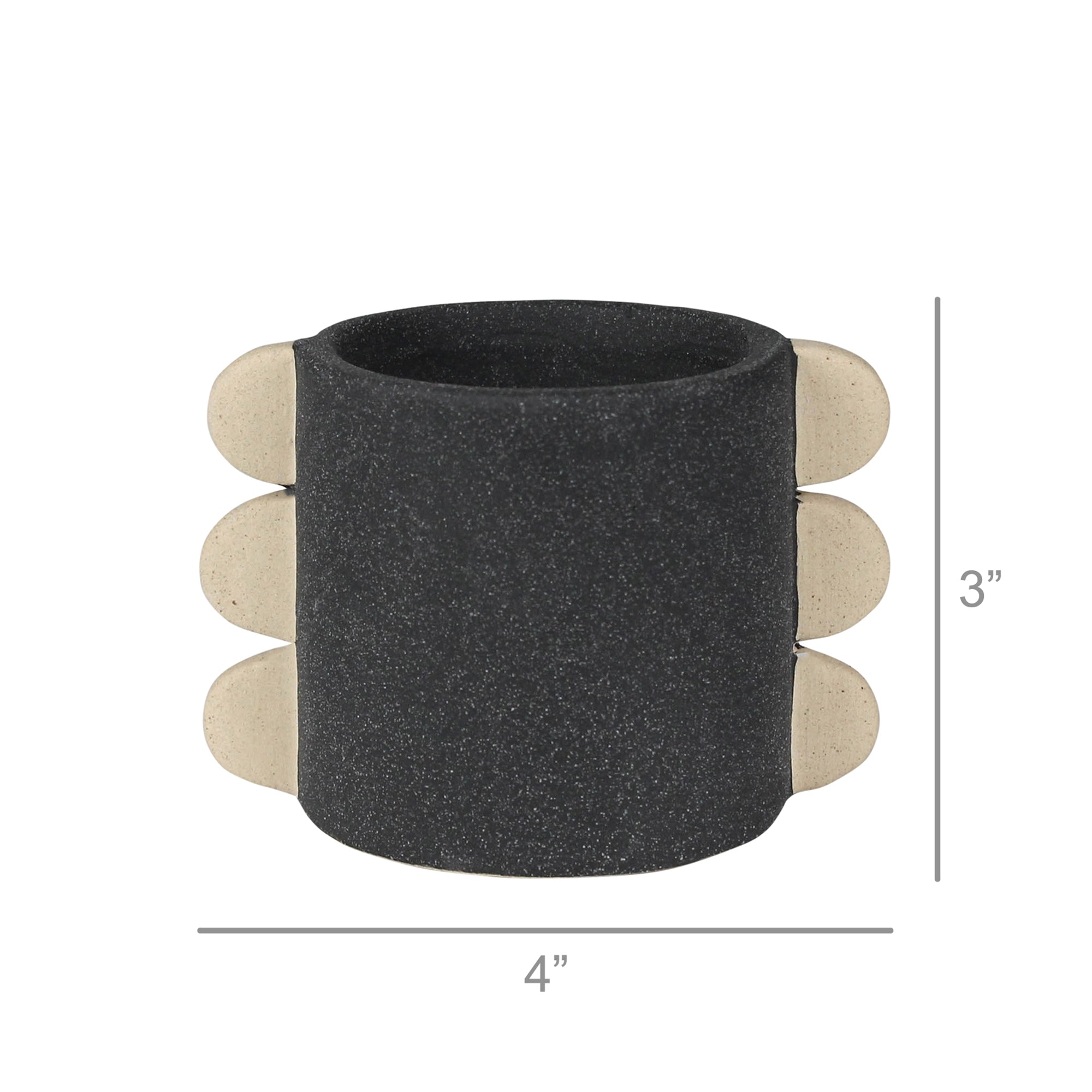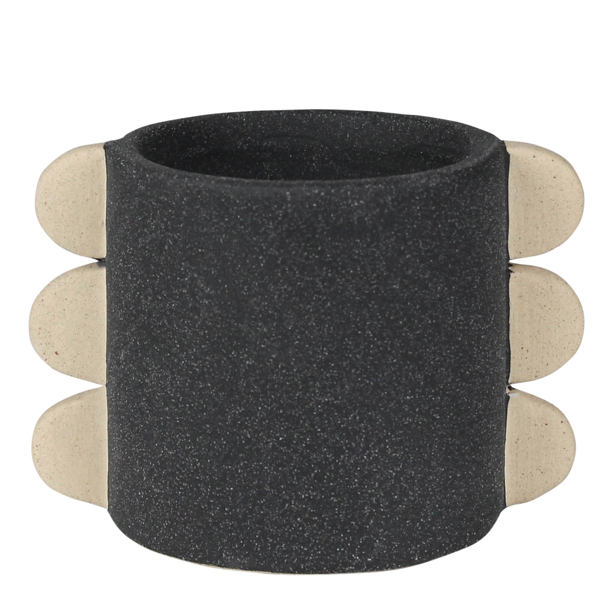 This global-chic cachepot in duo tone matte ceramic and stand-out statement side detail is in the perfect palette to be filled with a colorful potted plant. Sized for 2.5” drop-in pot.