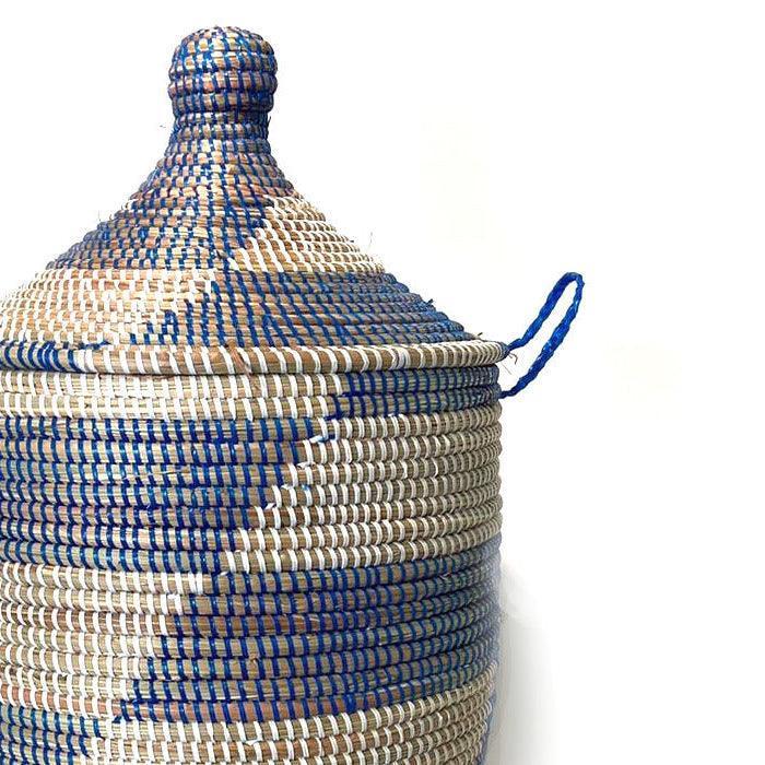 This versatile blue and white African basket adds a colorful splash of African decor to any room. A perfect storage container, it has both practical functionality and contemporary style.These lovely baskets are hand woven in Senegal from cattail, a grass-like plant, and colorful plastic threads which add strength and durability. Bring one home today!