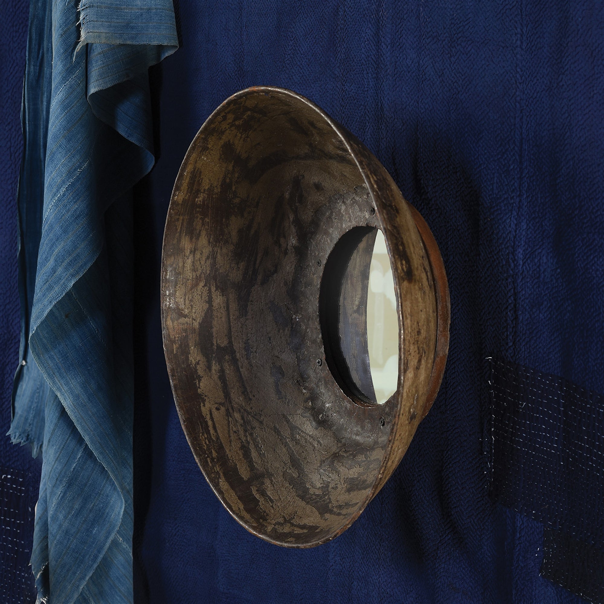 Salvaged Metal Bowls, which were once used for the transport of rocks and soil, are given a break from the heavy lifting and turned into a concave form for a mirror. Each piece is unique, shapes, sizes and finish will vary.