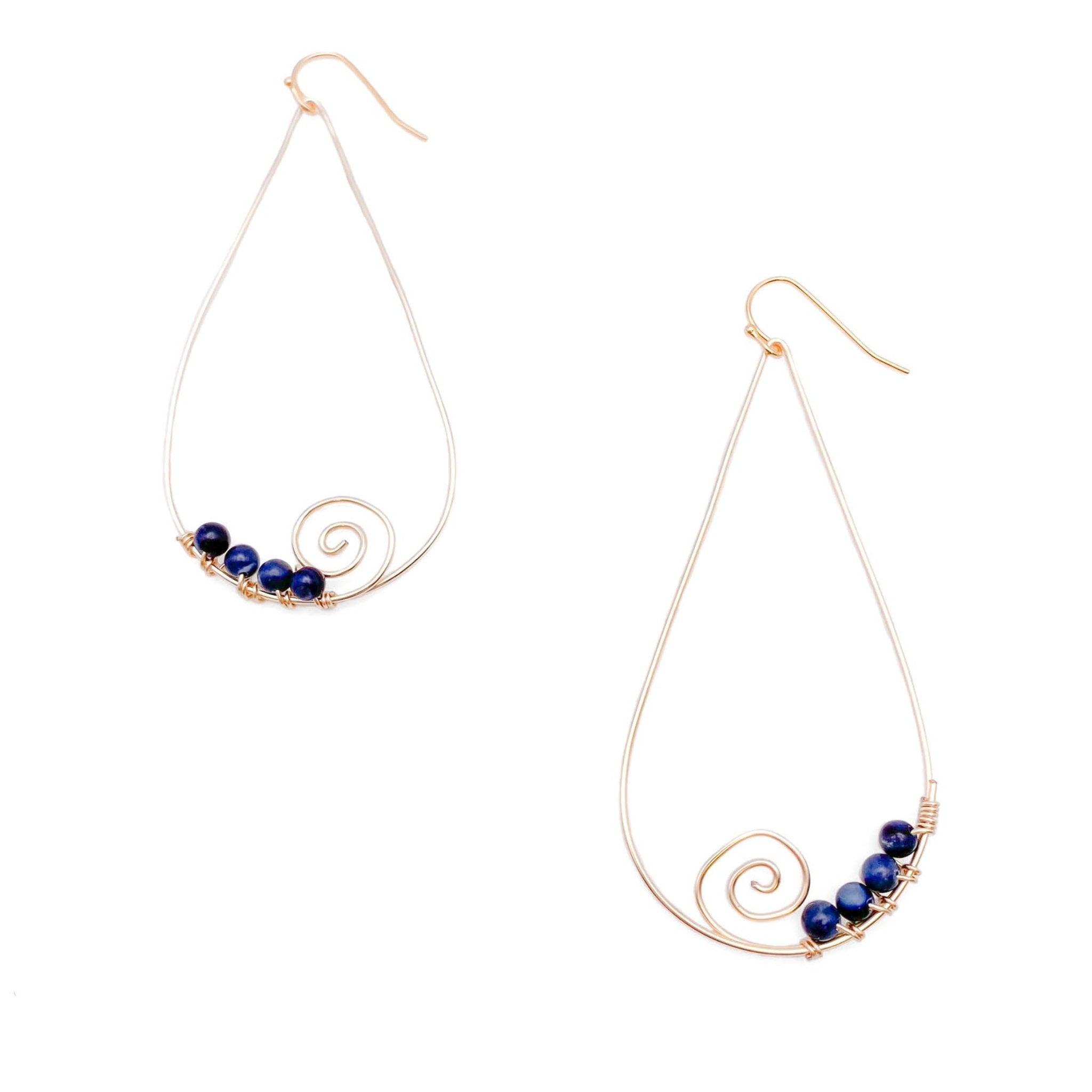 Unique designs from Honduras are always some of our favorites! These statement gold plated wire teardrops with swirl detailing and 4 denim blue jades hand wired onto the bottom will have you reaching for it all summer long!