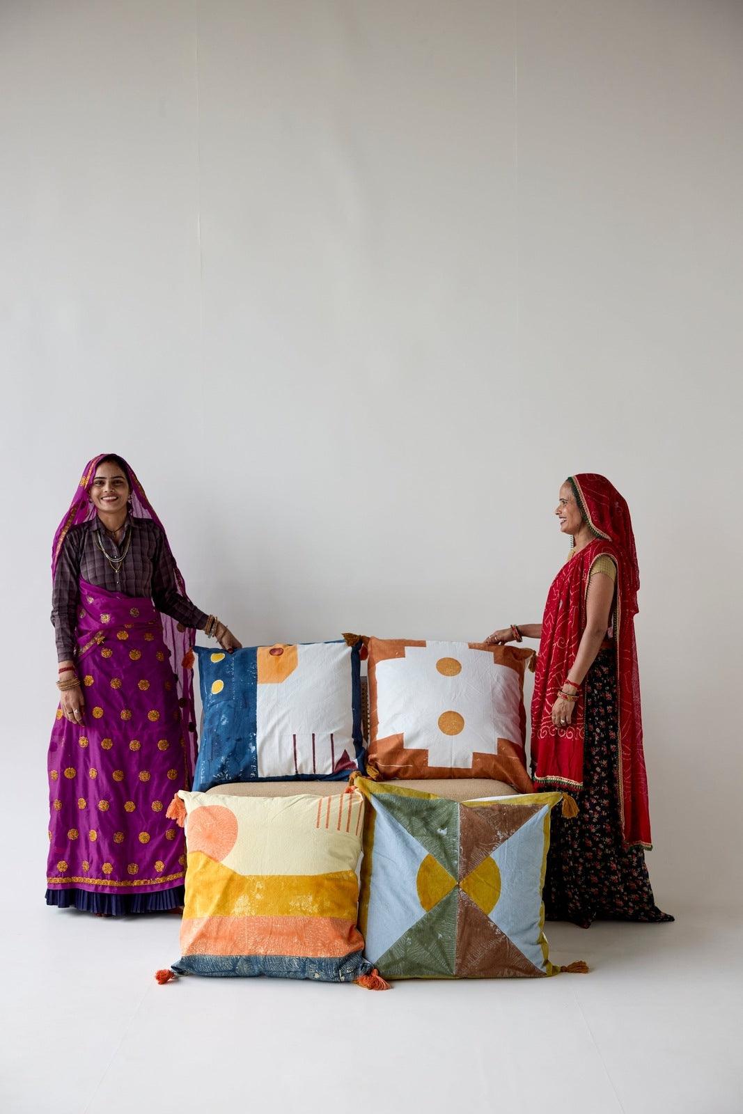 Our Mojave pillow sham is made from 100% cotton and features a striking hand-block printed design. The abstract geometric pattern includes a modern motif in shades of blue, maroon, orange, and yellow. Each pillow sham is handmade, requiring attention from 4 artisans, including wood-block carvers, hand-printers, sewists, and dye specialists.