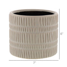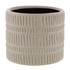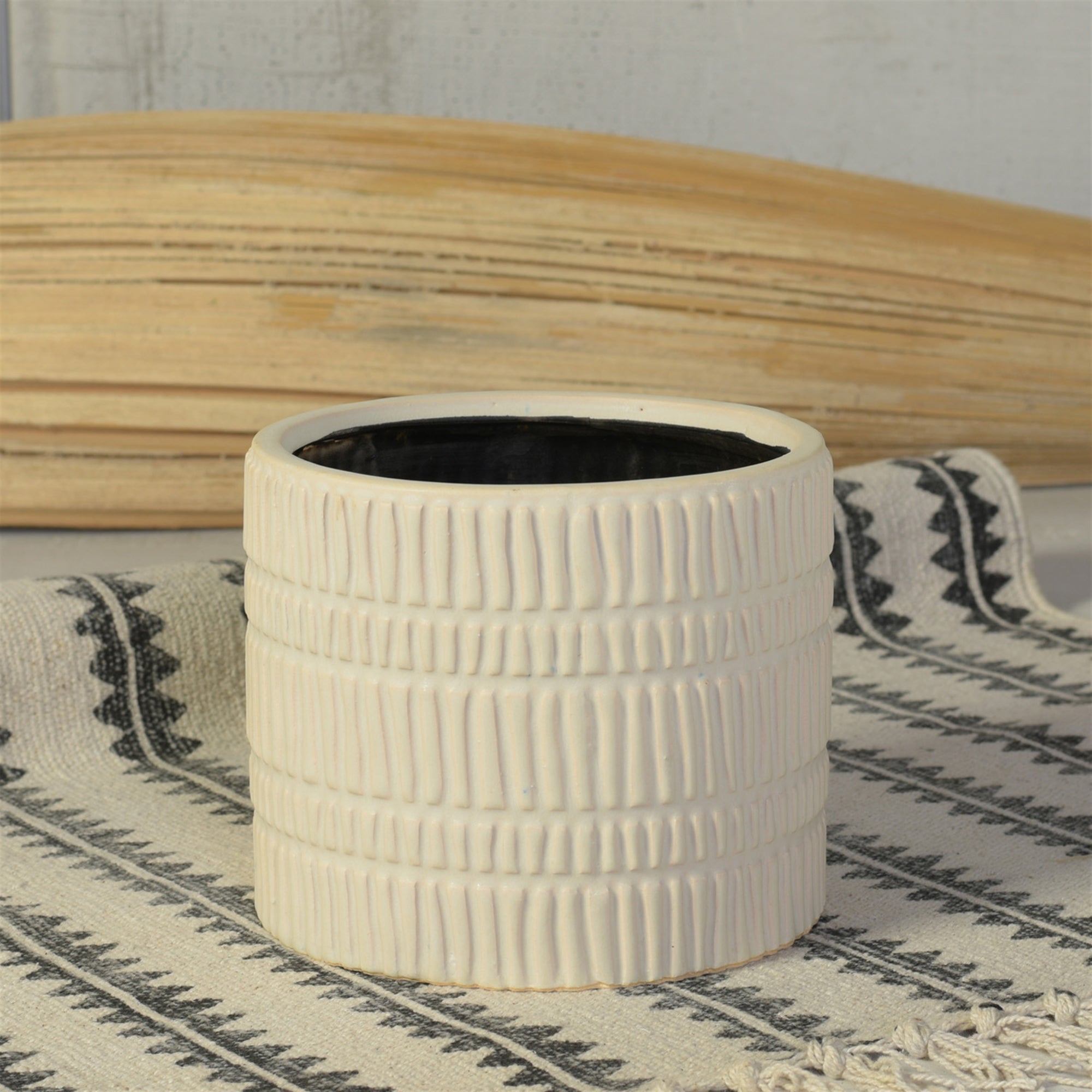 Textural bands wrap around this ceramic cachepot and are given a subtle undulation in shade with a matte white glaze.