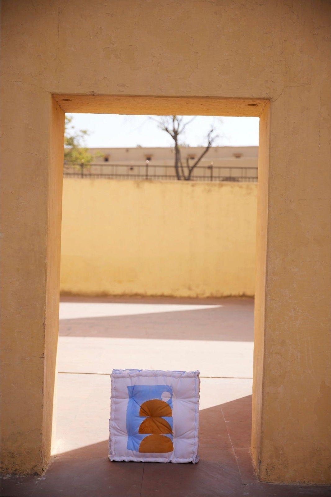 The cushion’s design is hand-pressed onto cotton using hand-carved wooden blocks dipped in dyes. The printed cotton shells are then brought to the homes of sewists who stuff and stitch the pillows by hand, creating the final product.