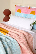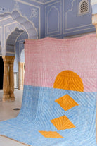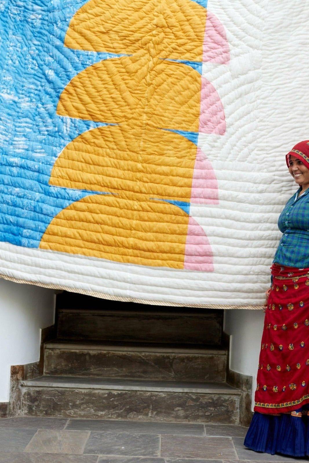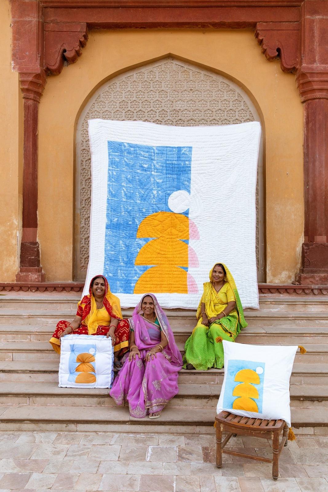 The design is hand-pressed onto each quilt using hand-carved wooden blocks dipped in dyes. The printed cotton shells are brought to the homes of quiltmakers, who stuff and stitch the quilts by hand, creating the final product.