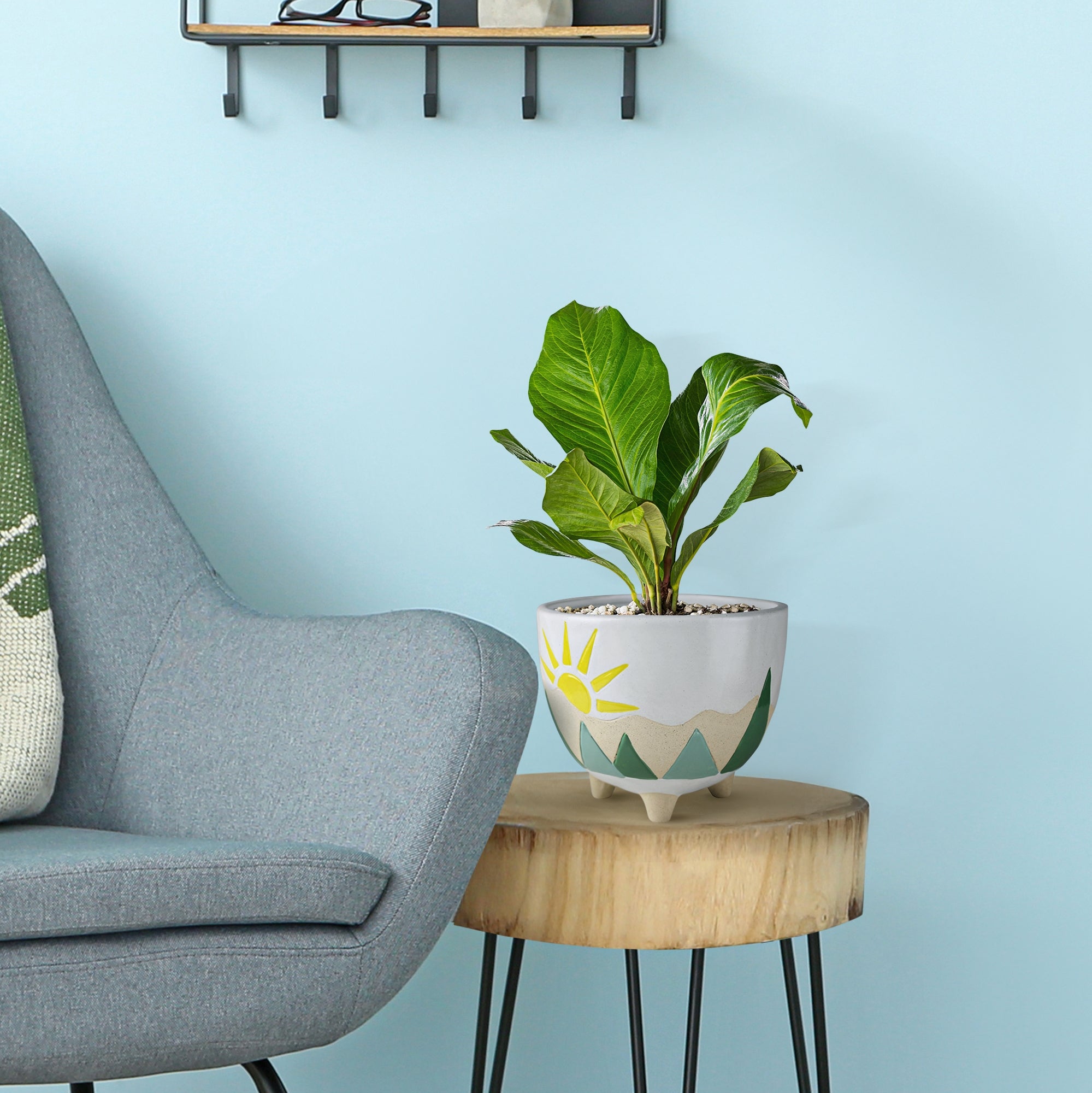 The mountains, pine trees and sun are captured 360 degrees in this unique ceramic footed vessel.