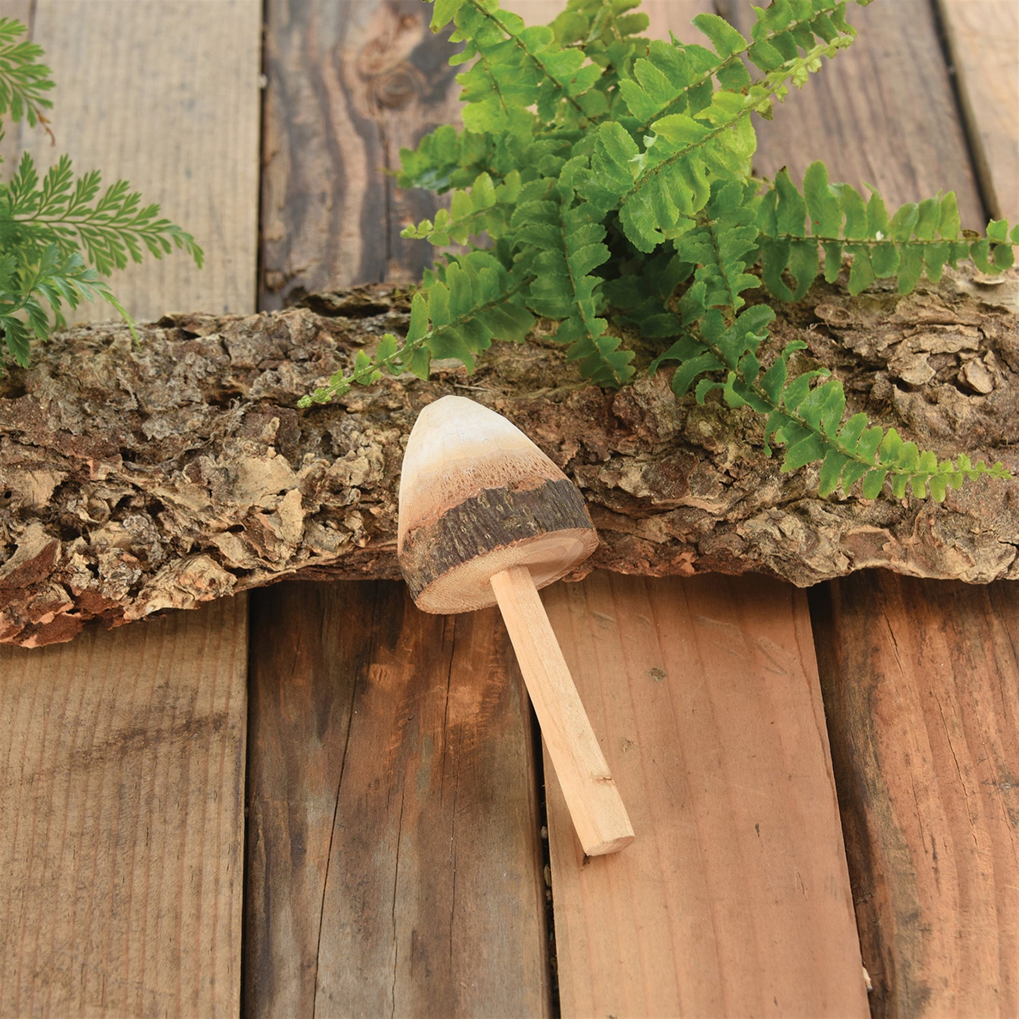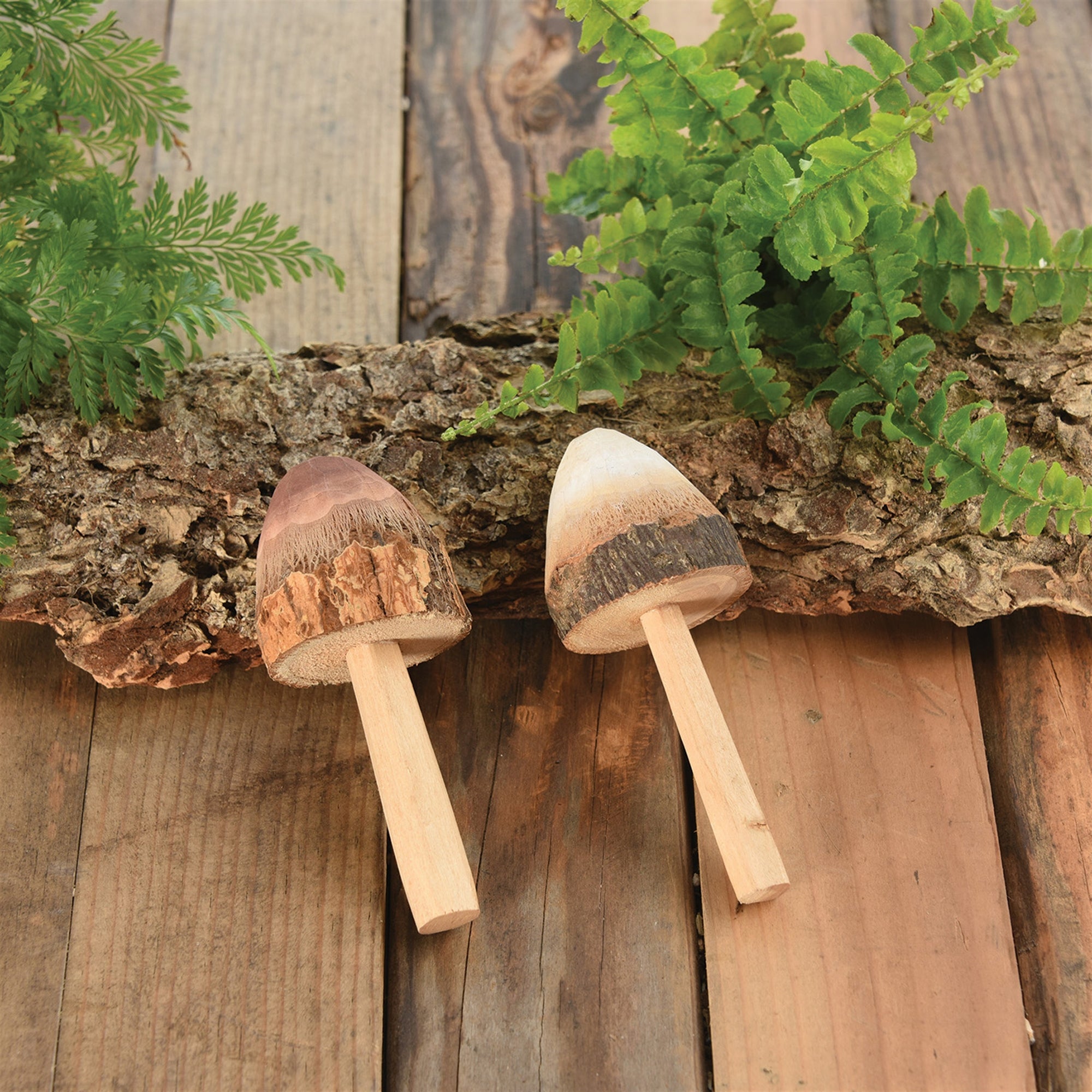 Hand carved in a mindful way to preserve some of the original bark, our carved wood mushrooms are fit to adorn a potted plant and happily at home in a fairy garden.