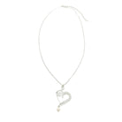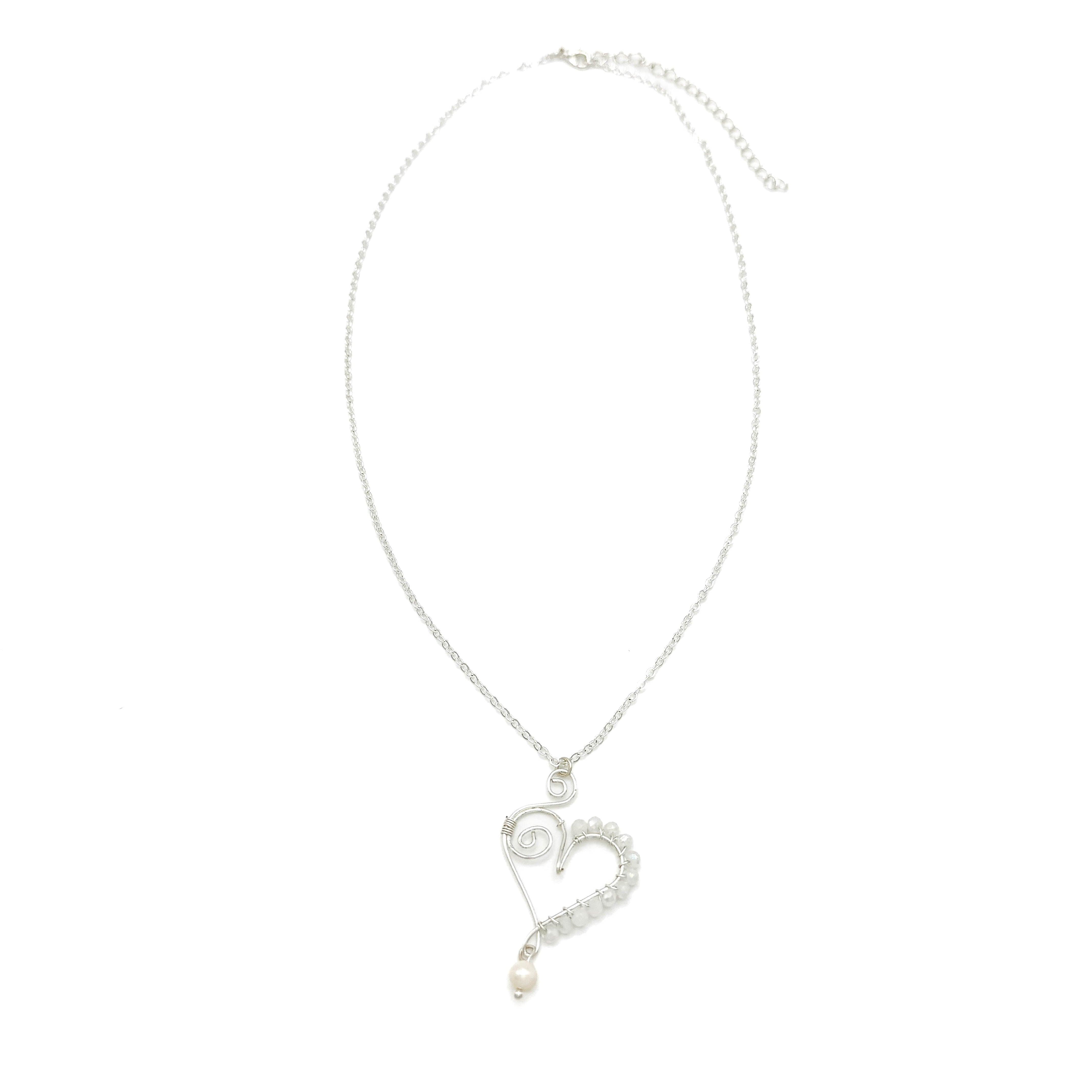 My Love is a work of art! A hand-formed silver plated wire heart is laced on one side with irridescent white faceted crystals, and the other side features a swirl of silver wire. One solitary 4mm freshwater pearl dangles from the bottom loop of the heart. A swirl of silver forms the bail of the pendant as it's suspended from a 19 inch silver plated drawn cable chain with a lobster claw closure and 3 inch extender. Pendant total length 1 7/8 inches.