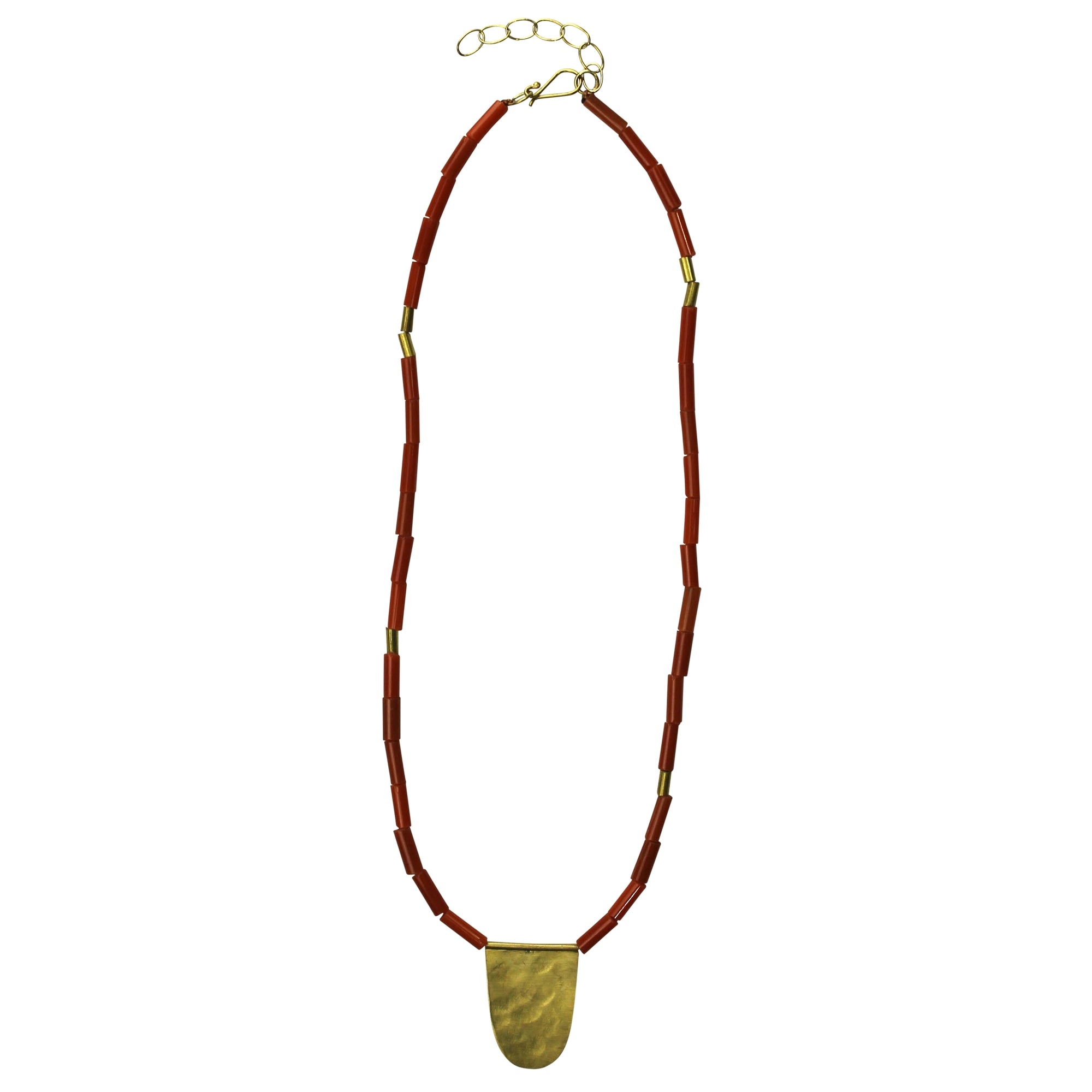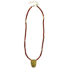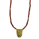 Step into bold style with our handmade Brass Necklace, showcasing red beads and a striking arch pendant in brass. Perfect for making a statement with artisanal flair. 1.25" pendant on 18" adjustable strand