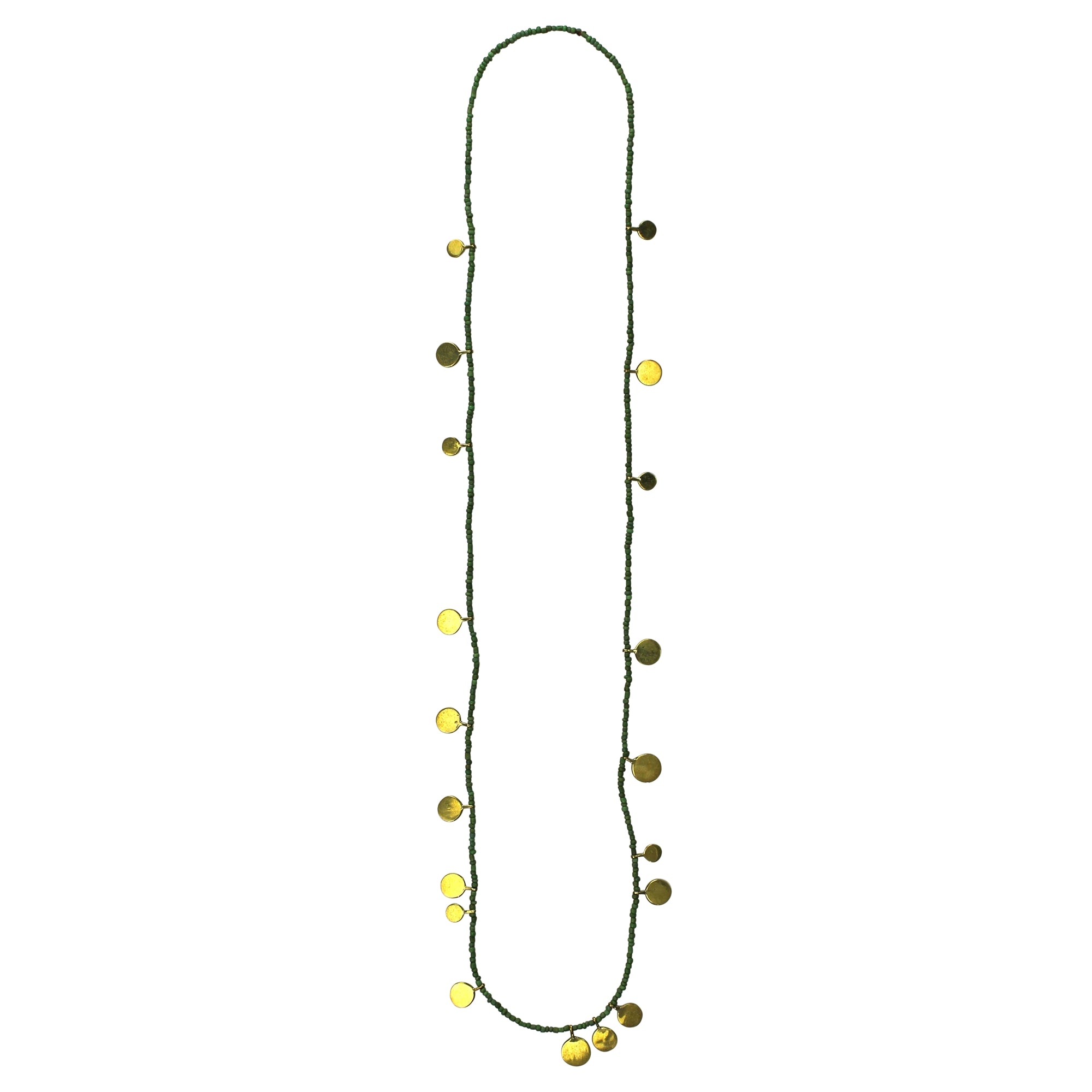 Necklace, Brass Tabs on Green Beads