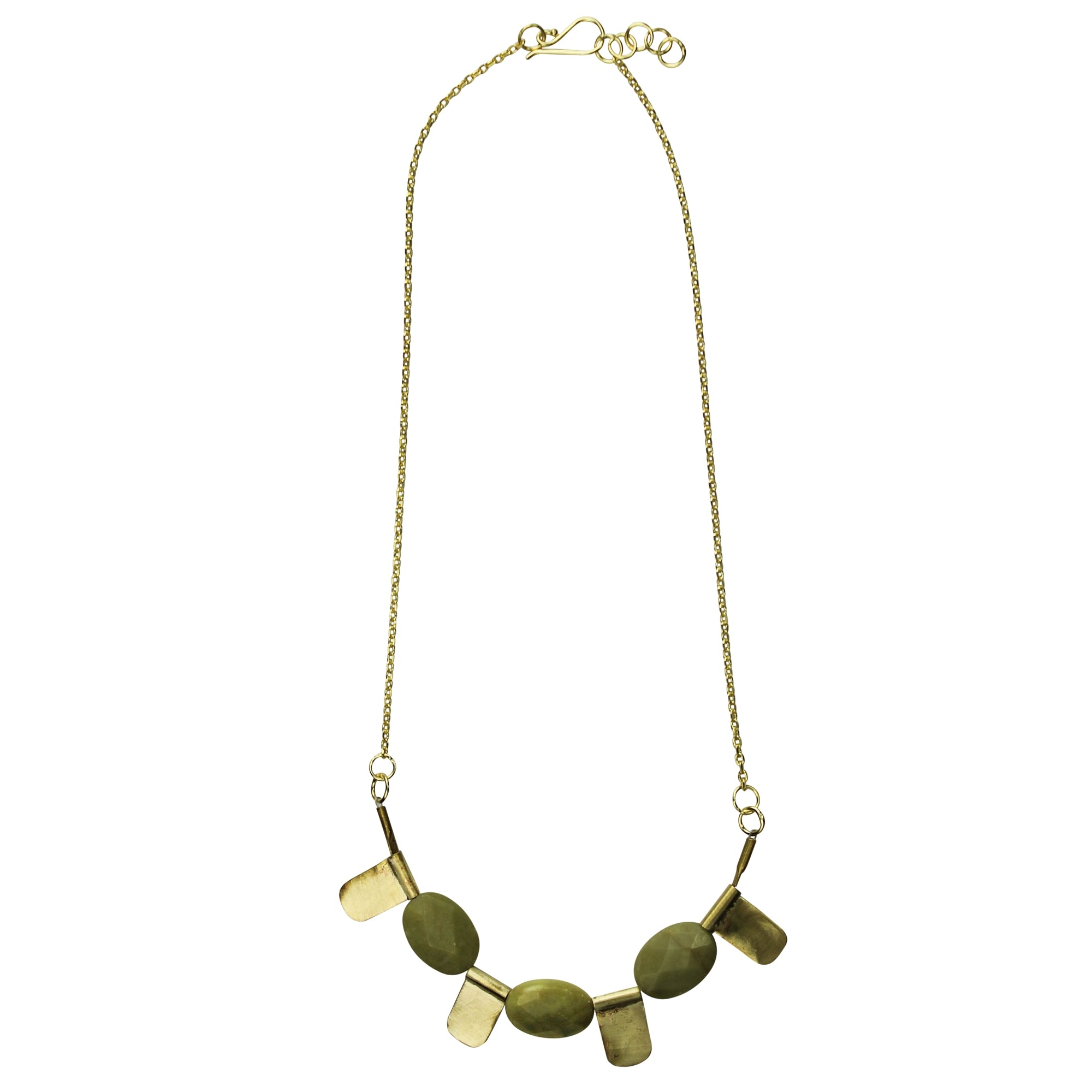 A statement piece with a strong artisanal aesthetic, this necklace is crafted from brass and features 3 faceted ovals of olive jade. Adjustable sizing. 18” adjustable