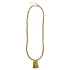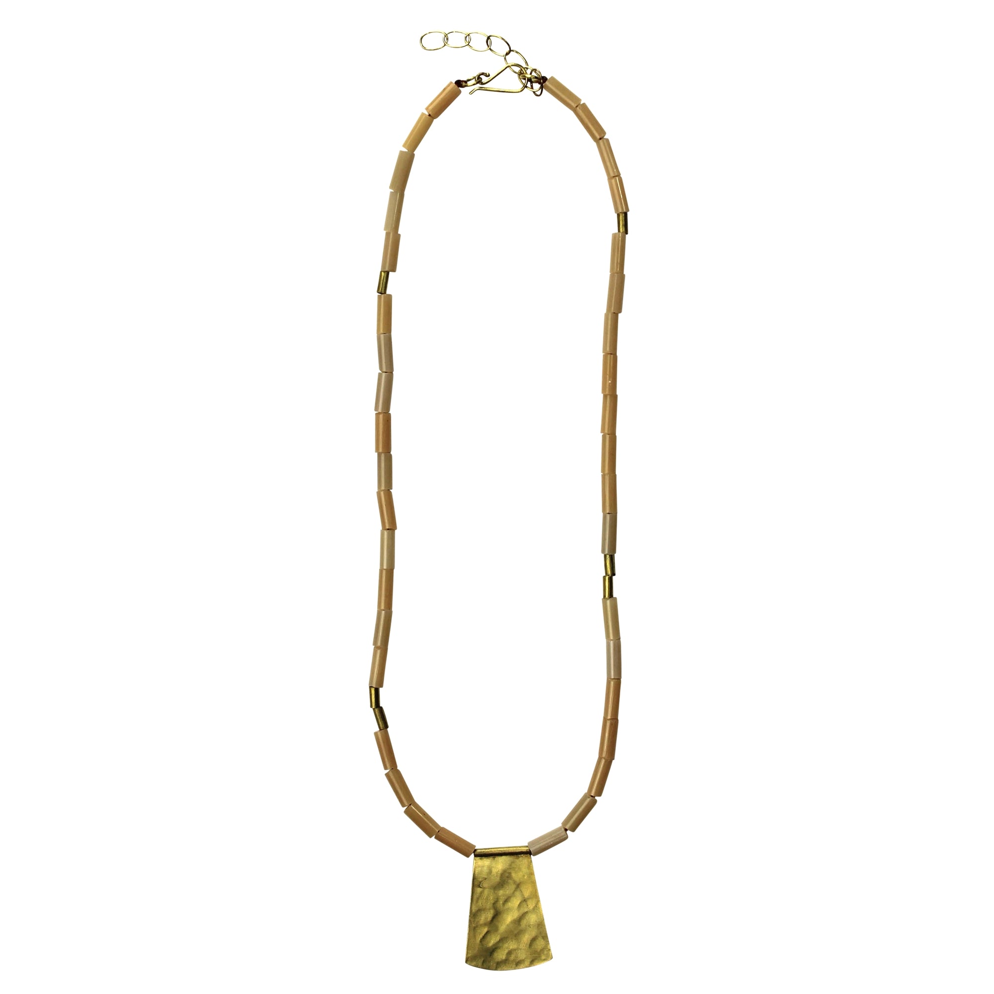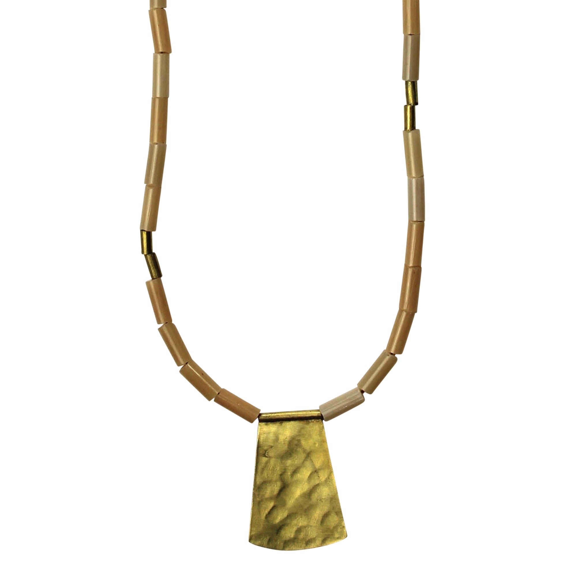 Step into bold style with our handmade Brass Necklace, showcasing blush beads and a striking fan pendant in brass. Perfect for making a statement with artisanal flair. 1.25" pendant on 18" adjustable strand